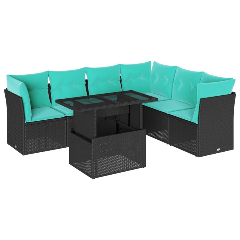 7-teiliges Gartensofa-Set mit Kissen, schwarzes Polyrattan – Massivholz Akazie – Massivholz Akazie