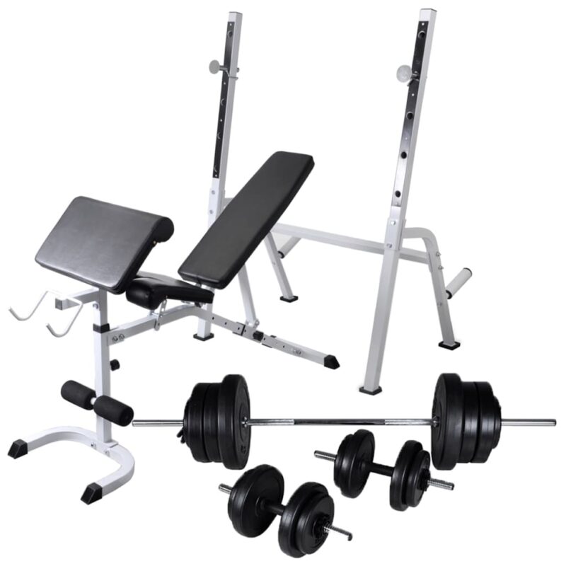 Hantelbank mit Ablage, Langhantel und