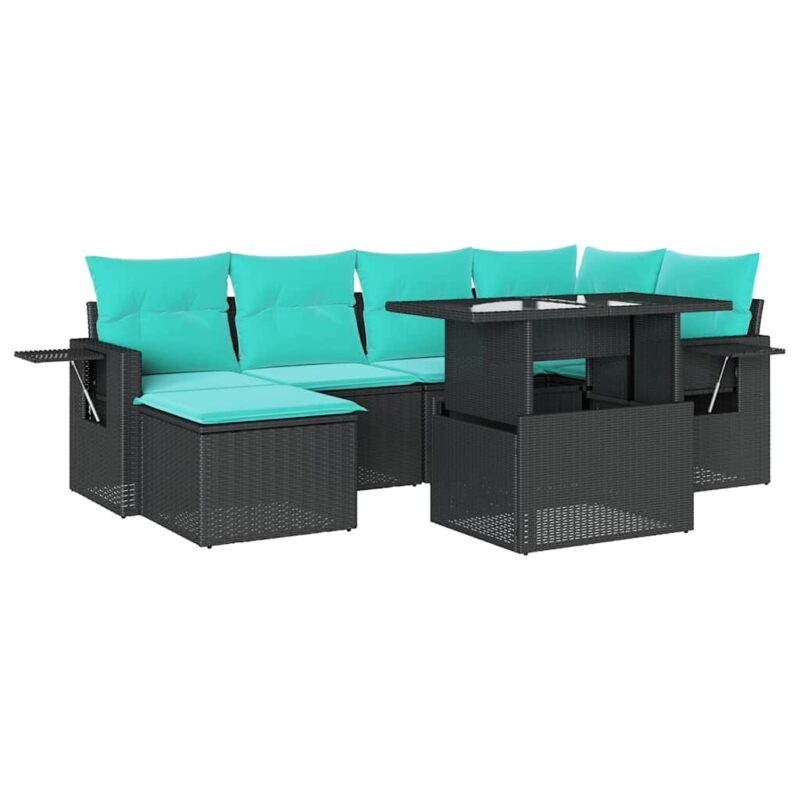 7-teiliges Gartensofa-Set mit Kissen, schwarzes Polyrattan – Massivholz Akazie