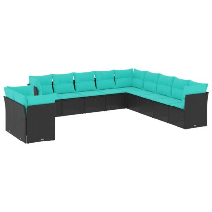 11-teiliges Gartensofa-Set mit Kissen, schwarzes Polyrattan