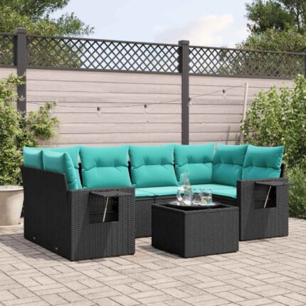 7-teiliges Gartensofa-Set mit Kissen, schwarzes Polyrattan