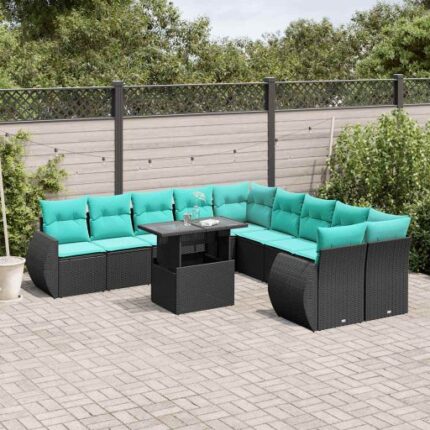 11-teiliges Gartensofa-Set mit Kissen, schwarzes Polyrattan