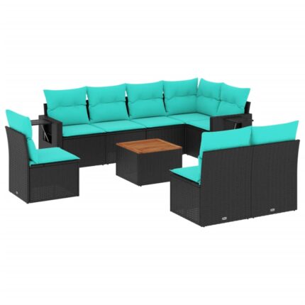 9-teiliges Gartensofa-Set mit Kissen, schwarzes Polyrattan