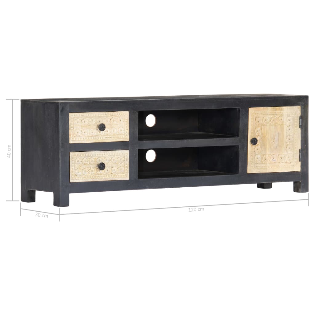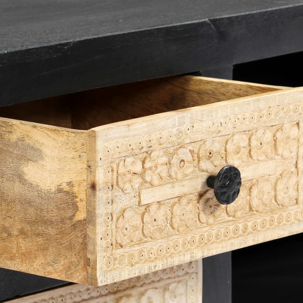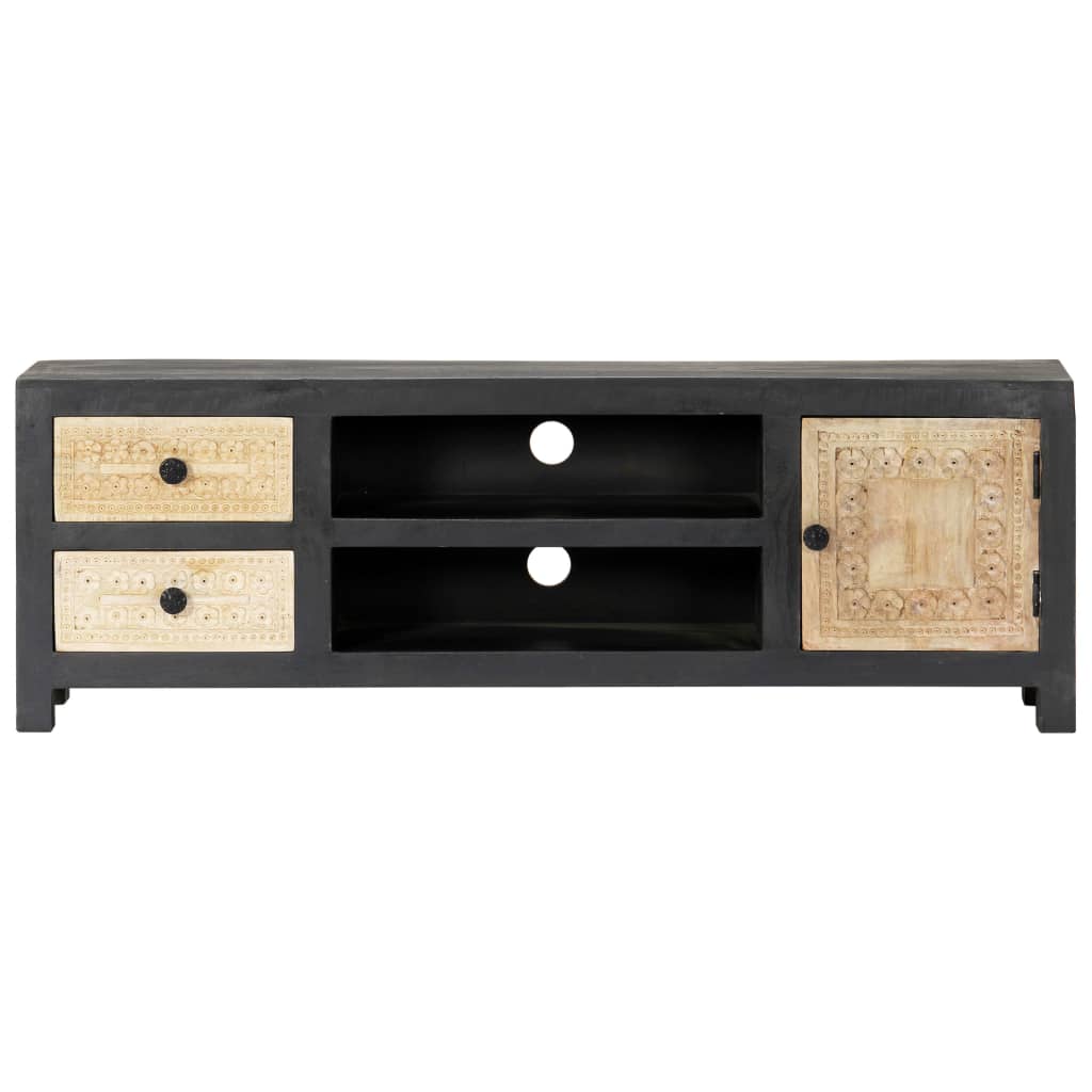 Bringen Sie den Luxus der Handschnitzerei mit unserem eleganten Holz-TV-Schrank in Ihr Zuhause! Ausgestattet mit 1 Tür, 2 Schubladen und 2 Fächern, die reichlich Stauraum bieten, ist dieser TV-Schrank sowohl eine praktische als auch eine dekorative Bereicherung für Ihr Wohn- oder Schlafzimmer. Aus massivem Mangoholz gefertigt, wurde der HiFi-Schrank mit einem schönen Finish durch Polieren, Anstreichen und Lackieren versehen, um eine raffinierte Optik aufzuweisen. Darüber hinaus unterstreichen die handgeschnitzten Muster auf der Tür und den Schubladen die Schönheit des Sideboards. Der Fernsehtisch lässt sich mit einem feuchten Tuch ganz einfach reinigen. Werten Sie Ihr Interieur mit unserem eleganten TV-Schrank auf!
