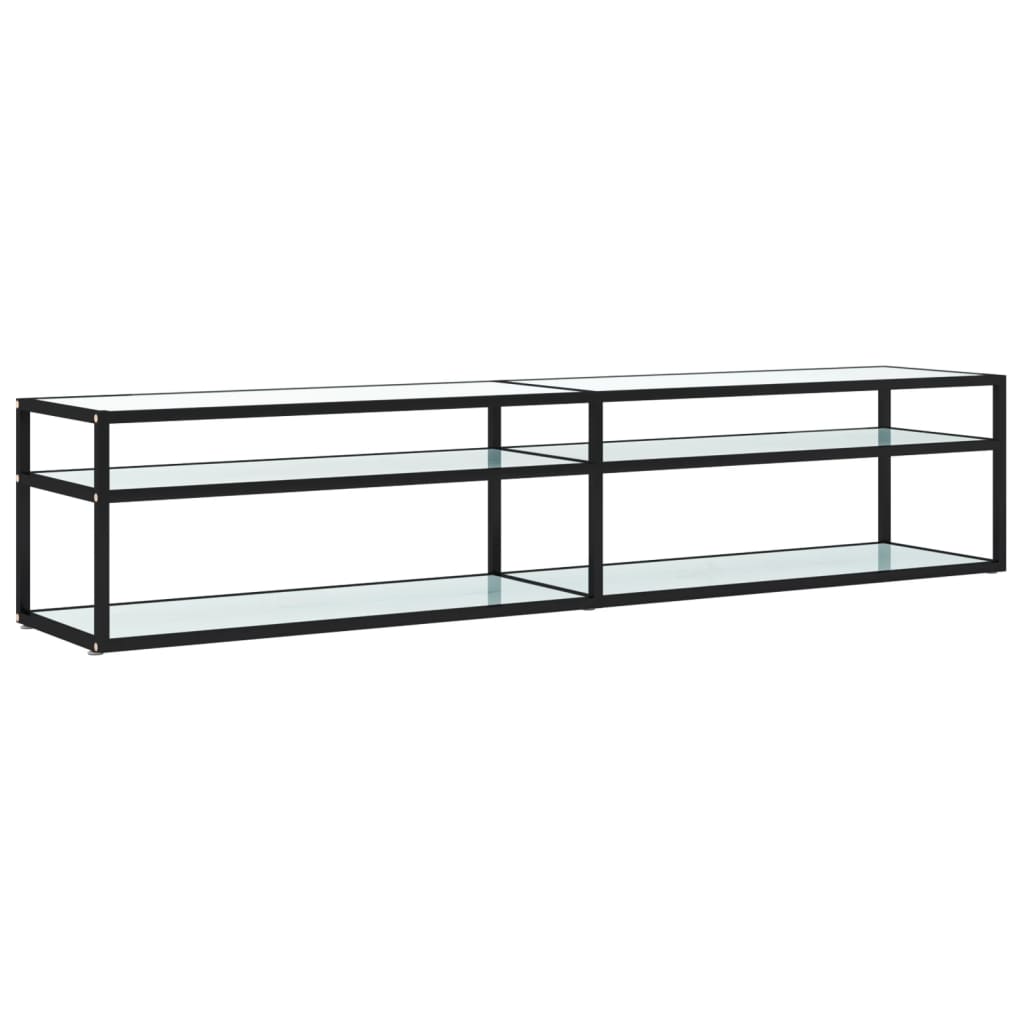 Dieses TV-Möbel wird mit seinem schlanken und modernen Design eine praktische Ergänzung zu deinem Wohnzimmer sein. Der TV-Tisch ist aus gehärtetem Glas gefertigt, wodurch er sehr robust und stabil ist. Außerdem lässt sich dieses moderne Möbelstück leicht mit einem feuchten Tuch reinigen. Der Rahmen aus pulverbeschichtetem Stahl trägt zu seiner Robustheit und einzigartiger Optik bei. Die Ablage unter der Tischplatte bietet reichlich Platz, um DVDs, Bücher und andere wichtige Kleinigkeiten geordnet und griffbereit aufzubewahren.