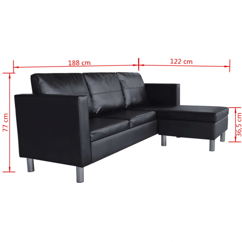 Dieses qualitativ hochwertige Sofa, bezogen mit Kunstleder, ist ein perfekter Platz zum Faulenzen, Fernsehen, oder Relaxen mit der Familie und Freunden. Dieses Sofa verfügt über breite Sitze und dick gepolsterte Kissen für höchsten Sitzkomfort. Das Sofa-Set ist mit glänzendem und strapazierfähigem Kunstleder bezogen, wodurch es einfach zu reinigen ist. Die Ecken sind stabil konstruiert und haben robuste, verchromte Eisenfüße. Dieses vielseitige Anbausofa verfügt über eine Chaiselongue, die an beiden Seiten aufgestellt werden kann, wodurch es für viele Wohnzimmereinrichtungen geeignet ist. Kinderleichter Zusammenbau. Die Lieferung umfasst 1 L-förmiges Sofa, 3 Sitzpolster und 3 Kissen.