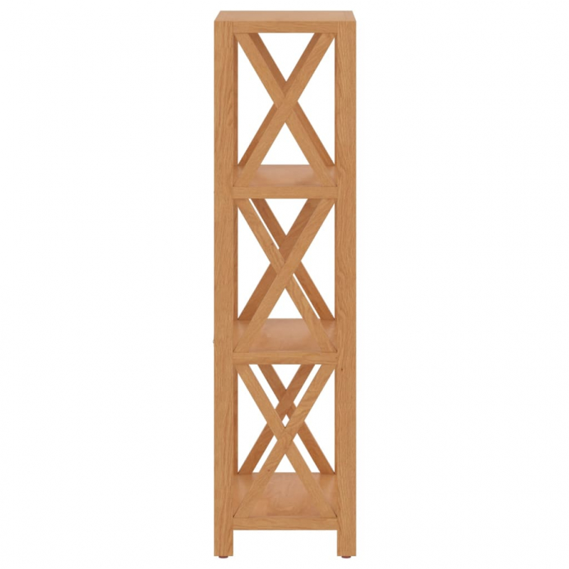 In diesem Holzregal kannst du deine Sachen sauber und ordentlich aufbewahren, um für Ordnung in deinem Wohnraum zu sorgen! Massives Eichenholz: Das Regal ist aus massivem Eichenholz gefertigt. Massives Eichenholz ist ein schönes Naturmaterial. Eichenholz besitzt eine mittelbraune Farbe und eine dichte Maserung, was zu seiner einzigartigen Optik beiträgt.Reichlich Stauraum: Mit 4 Ablagen versehen, bietet das Regal reichlich Platz, um deine Bücher, Zeitschriften, Sammlerstücke, Bilderrahmen oder andere wichtige Sachen gut geordnet und in Reichweite aufzubewahren.Stabiler Rahmen: Die Streben in X-Form machen den gesamten Rahmen des Regals robuster und stabiler.Vielseitig einsetzbar: Das Holzregal kann als Bücherregal, Pflanzenregal, Badezimmerregal oder sogar als Küchenregal verwendet werden. Mit seinem minimalistischen Design ist es perfekt für dein Zuhause und Büro geeignet. Achtung:Um ein Umkippen zu vermeiden, sollte dieses Produkt mit der mitgelieferten Wandhalterung gesichert werden.