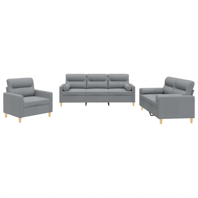 Diese Sofagarnitur bietet einen ausgezeichneten Platz zum Plaudern, Lesen, Fernsehen oder einfach nur zum Entspannen. Sie wird ein echter Blickfang in deinem Zuhause sein. Strapazierfähiger Stoff: Der Stoff zeichnet sich durch einen schlichten und sauberen Look aus und ist gleichzeitig atmungsaktiv und langlebig.Robustes und stabiles Gestell: Das Gestell aus Sperrholz und Metall verleiht der Sofagarnitur Robustheit und Stabilität.Bequemes Sitzerlebnis: Mit dick gepolsterten Sitzflächen, Armlehnen und Rückenkissen versehen, ist das Sofa sehr bequem.Praktische Rollkissen: Diese Zylinderkissen werten nicht nur deine Einrichtung auf, sondern sorgen auch für zusätzlichen Komfort beim Sitzen oder Liegen.