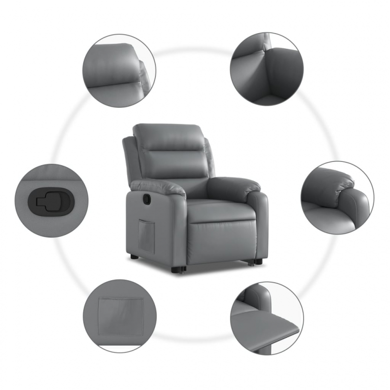 Lehne dich zurück und entspanne dich in diesem äußerst bequemen Relaxsessel mit Aufstehhilfe! Elektrische Aufstehhilfe: Dieser Relaxsessel ist mit einem Elektromotor zum Anheben ausgestattet. Dank der Aufstehhilfe, die den gesamten Sessel nach oben bringt, kannst du ganz einfach auf Knopfdruck aufstehen, ohne deinen Rücken und deine Knie zu belasten.Manuelle Liegefunktion: Dieser Ruhesessel lässt sich mittels des Griffs an der rechten Seite verstellen. So kannst du das Fußteil und die Rückenlehne manuell in jede beliebige Position bringen, um höchsten Komfort zu genießen. Die Rückenlehne lässt sich max. 135 Grad nach hinten verstellen. Durch einfaches Ziehen lässt sie sich schnell wieder in die ursprüngliche Position bringen.Bequemes Sitzerlebnis: Der dick gepolsterte Sitz, die Rückenlehne und die breiten, mit Kunstleder bezogenen Armlehnen sorgen für ein behagliches und angenehmes Sitzgefühl. Künstliches Leder ist ein äußerst langlebiges Material. Es ist schmutzabweisend und lässt sich mit einem feuchten Tuch einfach reinigen. Durch die glatte Oberfläche weist es die luxuriöse Schönheit von Echtleder auf.Praktische Seitentasche: Dieser Sessel verfügt über eine Seitentasche, in der du wichtige Sachen griffbereit aufbewahren kannst.Solider und stabiler Rahmen: Der Rahmen aus Holz und Metall sorgt für eine solide Struktur und hohe Stabilität. Dieser TV-Sessel ist bequem und langlebig.