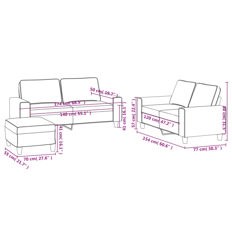 Diese Sofagarnitur bietet einen ausgezeichneten Platz zum Plaudern, Lesen, Fernsehen oder einfach nur zum Entspannen. Sie wird ein echter Blickfang in deinem Zuhause sein. Strapazierfähiger Stoff: Der Stoff zeichnet sich durch einen schlichten und sauberen Look aus und ist gleichzeitig atmungsaktiv und langlebig.Robustes und stabiles Gestell: Das Gestell aus Sperrholz und Metall verleiht der Sofagarnitur Robustheit und Stabilität.Bequemes Sitzerlebnis: Mit dick gepolsterten Sitzflächen, Armlehnen und Rückenkissen versehen, ist das Sofa sehr bequem.Vielseitiger Fußhocker: Der Hocker eignet sich zum Ausruhen der Füße beim Liegen auf dem Sofa, kann aber auch als zusätzliche Sitzgelegenheit in deinem Zimmer dienen. Darüber hinaus eignet er sich durch sein schlichtes Design und seine kompakte Größe für fast alle Wohnräume.