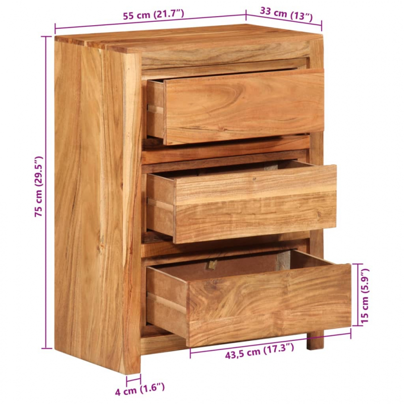 Dieser Schubladenschrank aus Holz versprüht einen eleganten Charme und ist ein echter Hingucker in deinem Interieur. Robust und stabil: Akazienholz ist für seine Festigkeit und Haltbarkeit bekannt. Seine vielfältige Farbe und seine einzigartige Maserung sorgen für eine attraktive Optik. Dank seiner ausgezeichneten Stabilität und Witterungsbeständigkeit eignet es sich ideal für die Herstellung von Innen- und Außenmöbeln.Viel Stauraum: Der Beistellschrank verfügt über 3 Schubladen, sodass du deine Sachen geordnet aufbewahren kannst.Stabile Oberplatte: Die stabile Oberplatte bietet den perfekten Platz für Topfpflanzen, Fotorahmen und andere Dekoartikel.Einfache Reinigung: Die Schubladenkommode lässt sich einfach mit einem feuchten Tuch reinigen. Achtung:Um ein Umkippen zu vermeiden, sollte dieses Produkt mit der mitgelieferten Wandhalterung gesichert werden. Gut zu wissen:Jedes Stück ist ein Unikat, das in Farbe und Maserung variiert. Die Lieferung erfolgt in zufälliger Reihenfolge, wodurch die Exklusivität und Individualität deines Produkts gewährleistet wird.