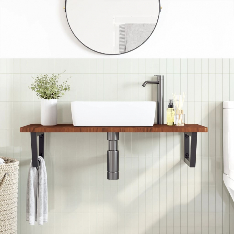 Die Waschtischplatte wird sicher an der Wand befestigt und bietet eine elegante und platzsparende Lösung für dein Badezimmer. Robust und langlebig: Diese Waschtisch-Platte hat Stahlhalterungen und eine Eichenholz-Platte, wodurch sie robust, stabil und langlebig ist. Platzsparend: Die schwebende Waschtischplatte bietet reichlich Platz für das Waschbecken, Seifen, Cremes sowie andere Kleinigkeiten. Dank der Trapezform kannst du Handtücher oder andere Dinge platzsparend an der Halterung aufhängen. Einfache Verwendung: Die Holzplatte ist nicht vorgebohrt, so dass dein Waschbecken je nach Bedarf links, rechts oder mittig installiert werden kann. Dank der vorgebohrten Löcher in der Halterung kann diese einfach mit der Tischplatte montiert und an der Wand befestigt werden. Vielseitige Anwendungsmöglichkeiten: Dank ihres modernen Designs fügt sie sich in verschiedene Arten von Bädern ein. Gut zu wissen:Die Schrauben sind nicht im Lieferumfang enthalten. Du kannst die Schrauben auf der Grundlage der unten aufgeführten Informationen separat erwerben. Wandbefestigung: 2 Stück M8-Dehnschrauben pro Halterung Holzplatte: 2 Stück M5x18-Schrauben (T=2) oder 2 Stück M5x20-Schrauben (T=2,5/4 cm) pro Halterung