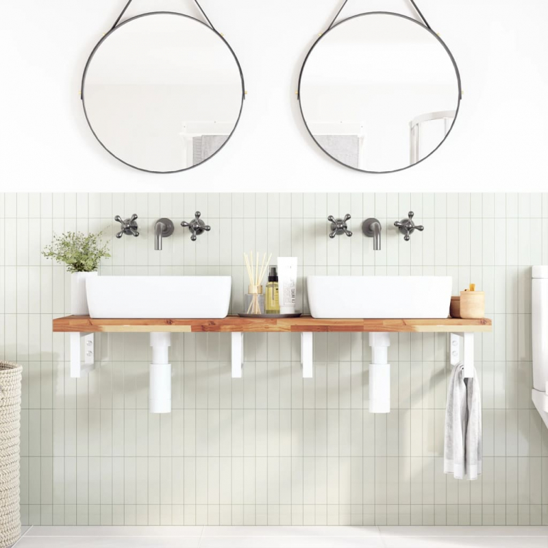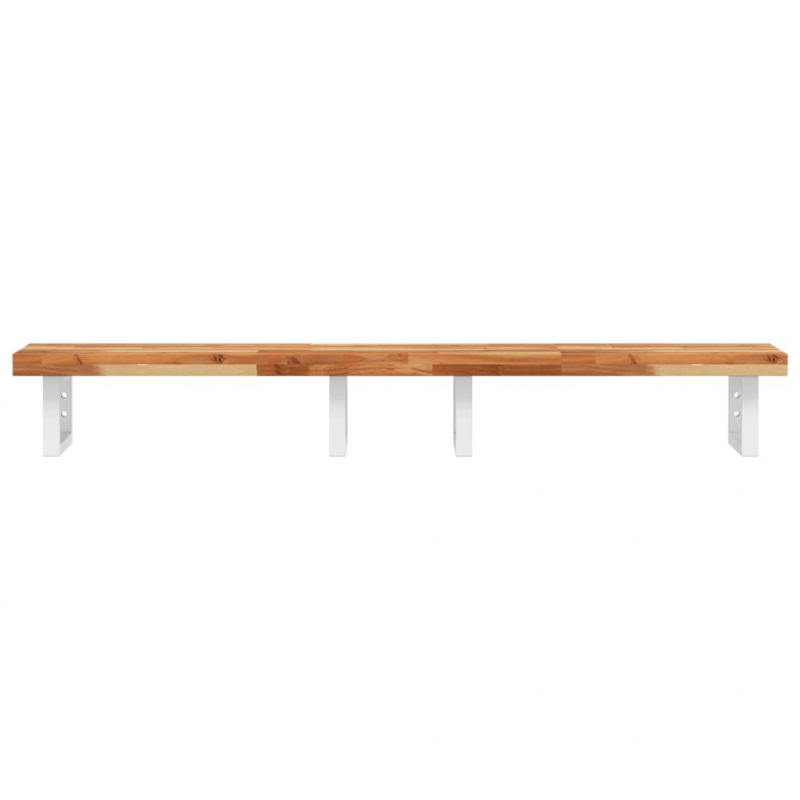 Das Regal lässt sich sicher an der Wand befestigen und bietet eine elegante und platzsparende Lösung für dein Badezimmer. Robust und langlebig: Dieses Waschbeckenregal besteht aus Stahlhalterungen und einer Oberplatte aus massivem Akazienholz, was es robust, stabil und langlebig macht.Platzsparend: Das Schweberegal bietet reichlich Platz für Cremes und verschiedene Kleinigkeiten. Dank der rechteckigen Form der Halterungen kannst du auch Handtücher oder andere Sachen darauf platzsparend aufhängen.Einfache Verwendung: Die Holzplatte ist nicht vorgebohrt, sodass dein Waschbecken je nach Bedarf links, rechts oder in der Mitte angebracht werden kann. Dank der vorgebohrten Löcher in der Halterung lässt sich die Ablage am Waschtisch oder an der Wand mühelos befestigen.Vielseitig einsetzbar: Dank ihres modernen Designs schafft die Ablage zusätzlichen Stauraum und fügt sich harmonisch in die unterschiedlichsten Einrichtungen ein. Gut zu wissen:Die Schrauben sind nicht im Lieferumfang enthalten. Du kannst die Schrauben anhand von den folgenden Informationen separat erwerben.Wandbefestigung: 2 x M8-Dehnschraube pro HalterungHolzplatte: 2 x M5x18-Schraube (T=2) oder 2 x M5x20-Schraube (T=2,5/4 cm) pro Halterung