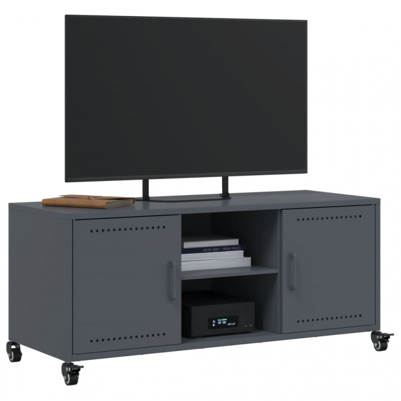 Mit seinem schlichten und dennoch praktischen Design passt dieser TV-Schrank perfekt zu deinem Wohnzimmer. Langlebiges Material: Stahl ist ein außergewöhnlich hartes und starkes Material. Er bietet Robustheit und Stabilität. Kaltgewalztes Stahlblech weist eine glatte Oberfläche auf und lässt sich präzise verarbeiten.Präsentation: Die stabile Oberplatte des Medienschrank bietet den idealen Platz, um Dekoartikel wie Bilderrahmen und Pflanzen zur Schau zu stellen.Viel Stauraum: Der TV-Ständer verfügt über 2 Türen und 2 Ablagen und bietet den idealen Platz, um all deine Zeitschriften, DVDs und andere Gegenstände aufzubewahren.Pflegeleicht: Dank seiner schmutzabweisenden Oberfläche lässt sich der TV-Schrank leicht abwischen und reinigen, um stets brandneu auszusehen.Einfaches Umstellen: Dieser Schrank verfügt über 4 Rollen und lässt sich daher flexibel und mühelos umher verschieben.