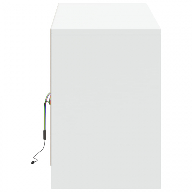 Mit seinem trendigen und zugleich praktischen Design wird dieser TV-Schrank mit LED-Leuchten definitiv zum Blickfang in Ihrem Wohnzimmer. Langlebiges Material: Holzwerkstoff ist ein Material außergewöhnlicher Qualität mit glatter Oberfläche. Er zeichnet sich durch Festigkeit, Stabilität und Feuchtigkeitsbeständigkeit aus.RGB-LED-Beleuchtung für ein angenehmes Ambiente: Dieser TV-Schrank verfügt über LED-Leuchten, die einfach eingestellt werden können, um eine personalisierte Lichtshow zu erzeugen. Du kannst die Modi, Farben und Helligkeit anpassen, um das Ambiente in deinem Wohnraum zu verbessern.Reichlich Stauraum: Dieser TV-Schrank bietet reichlich Stauraum, um deine Zeitschriften, Bücher, DVDs und Multimedia-Geräte ordentlich und griffbereit aufzubewahren.Stabile und robuste Oberplatte: Die robuste Oberplatte bietet den idealen Platz für deinen Fernseher und Stereoanlagen oder einige Dekoartikel wie Vasen oder Topfpflanzen. Gut zu wissen:Das Produkt verfügt über einen USB-Anschluss, für den eine zertifizierte 5V-USB-Stromquelle erforderlich ist (nicht im Lieferumfang enthalten). Achtung:Um ein Umkippen zu vermeiden, sollte dieses Produkt mit der mitgelieferten Wandhalterung gesichert werden.