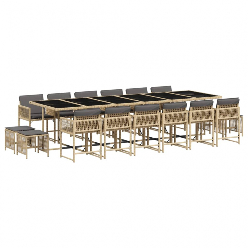 Diese Garten-Essgruppe ist eine ideale Wahl für Mahlzeiten im Freien oder einfach nur zum Entspannen im Garten, Hinterhof oder auf der Terrasse. Langlebiges Material: PE-Rattan, auch als Poly Rattan bekannt, ist ein robustes, pflegeleichtes synthetisches Material, das die Optik von natürlichem Rattan aufweist. Es kennzeichnet sich durch ein geringes Eigengewicht und lässt sich einfach reinigen. Aufgrund seiner Haltbarkeit und Witterungsbeständigkeit wird es häufig bei der Herstellung von Gartenmöbeln verwendet.Platzsparende Aufbewahrung: Dank der klappbaren Rückenlehne lassen sich die Stühle unter dem Tisch verstauen. Zudem finden auch die Hocker Platz unter den Stühlen, sodass die gesamte Essgruppe bei Nichtgebrauch eine platzsparende Würfelform bildet, um deinen verfügbaren Platz optimal auszunutzen.Bequemes Sitzerlebnis: Dieser Gartensessel mit dick gepolsterten Kissen bietet ein angenehmes Sitzgefühl.Abnehmbarer und waschbarer Bezug: Die Sitzkissen verfügen über abnehmbare Bezüge, die sich ganz einfach waschen und reinigen lassen. Dank der Klappen an der Rückseite können die Kissen ganz einfach an den Rückenlehnen befestigt werden.Tischplatte aus Glas: Die Tischplatte des Gartentisches besteht aus starkem und langlebigem Hartglas, sodass sie leicht mit einem feuchten Tuch gereinigt werden kann und deinem Außenbereich einen Hauch von Eleganz verleiht. Gut zu wissen:Wir empfehlen dir, deine Gartenmöbel mit einer wasserdichten Hülle zu schützen, um lange Zeit eine ansprechende Optik aufzuweisen.