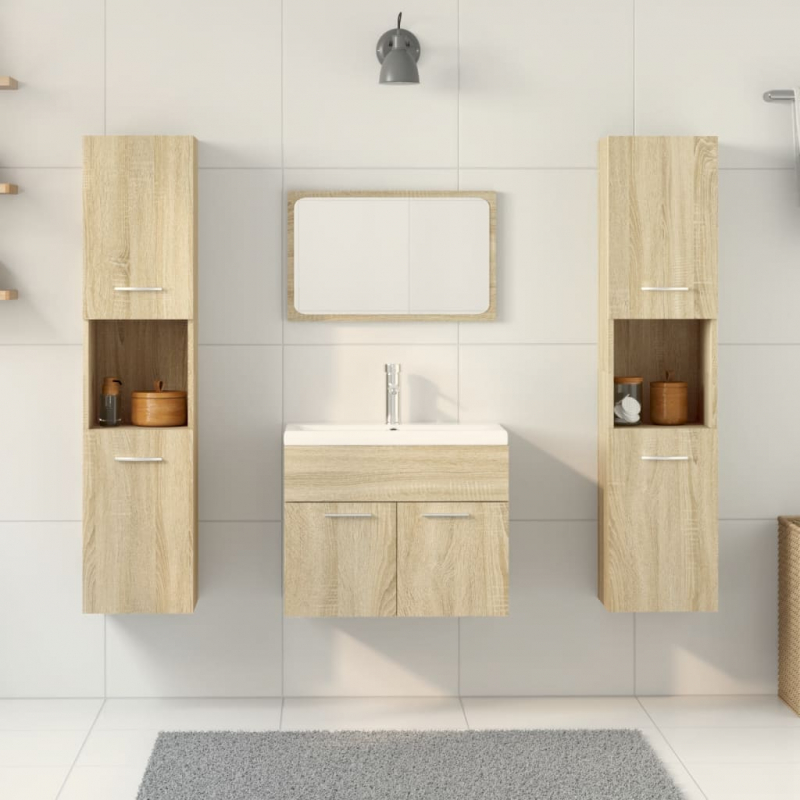 Dieses Badmöbel-Set ist eine hervorragende Ergänzung für dein Badezimmer. Es verleiht ihm ein aufgeräumtes und eindrucksvolles Aussehen! Langlebiges Material: Holzwerkstoff ist ein Material außergewöhnlicher Qualität mit glatter Oberfläche. Er zeichnet sich durch Festigkeit, Stabilität und Feuchtigkeitsbeständigkeit aus.Reichlich Stauraum: Der Hochschrank bietet reichlich Platz, um wichtigste Toilettenartikel und Badutensilien wie Seife, Shampoo, Zahnpasta usw. zu verstauen.Funktion zur Wandbefestigung: Der Badezimmerschrank und der Schminkspiegel können für zusätzlichen Stauraum an der Wand befestigt werden. Auf diese Weise kannst du deine Stellfläche maximieren und dein Zuhause übersichtlich halten.Klares Spiegelbild: Die Spiegelfläche aus Glas bietet eine feine und unverzerrte Spiegelung, sodass sie sich zum Schminken, Rasieren oder Gesichtspflege eignet. Gut zu wissen:Das Waschbecken ist nicht im Lieferumfang enthalten.Schrauben und Dübel für die Montage an der Wand sind nicht enthalten. Passendes Montagezubehör muss separat gekauft werden. Wenn du dir bezüglich der Montage nicht sicher bist, wende dich bitte an einen Fachmann. Bitte lies und befolge jeden Schritt in der Anleitung.