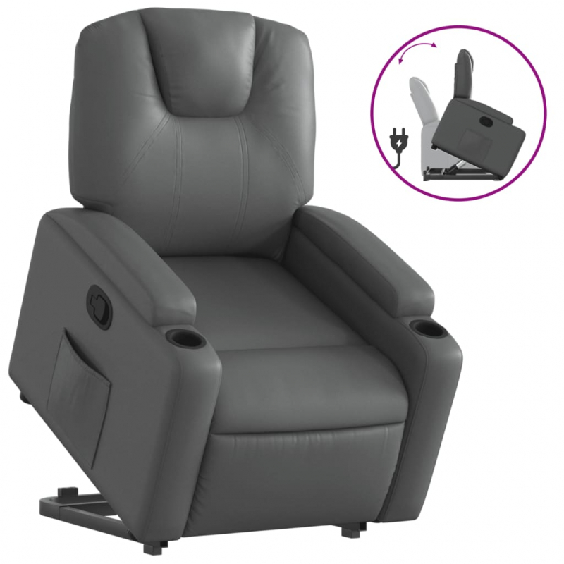 Lehne dich zurück und entspanne dich in diesem äußerst bequemen Relaxsessel mit Aufstehhilfe! Elektrische Aufstehhilfe: Dieser Relaxsessel ist mit einem Elektromotor zum Anheben ausgestattet. Dank der Aufstehhilfe, die den gesamten Sessel nach oben bringt, kannst du ganz einfach auf Knopfdruck aufstehen, ohne deinen Rücken und deine Knie zu belasten.Manuelle Liegefunktion: Dieser Ruhesessel lässt sich mittels des Griffs an der rechten Seite verstellen. So kannst du das Fußteil und die Rückenlehne manuell in jede beliebige Position bringen, um höchsten Komfort zu genießen. Die Rückenlehne lässt sich max. 135 Grad nach hinten verstellen. Durch einfaches Ziehen lässt sie sich schnell wieder in die ursprüngliche Position bringen.Bequemes Sitzerlebnis: Die dick gepolsterte Sitzfläche, die Rückenlehne und die breiten, mit Kunstleder bezogenen Armlehnen sorgen für ein behagliches und angenehmes Sitzgefühl. Kunstleder ist ein äußerst langlebiges Material. Es ist schmutzabweisend und lässt sich mit einem feuchten Tuch einfach reinigen. Durch die glatte Oberfläche weist es die luxuriöse Schönheit von Echtleder auf.Praktische Getränkehalter und Seitentasche: Dieser Sessel verfügt über zwei praktische Becherhalter und eine Seitentasche, in der du wichtige Sachen griffbereit aufbewahren kannst.Solider und stabiler Rahmen: Der Rahmen aus Holz und Metall sorgt für eine solide Struktur und hohe Stabilität. Dieser TV-Sessel ist bequem und langlebig.