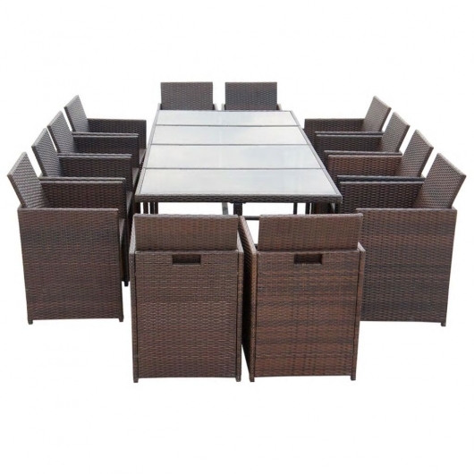 Diese stilvolle Rattan-Essgruppe wird der Hingucker in Ihrem Garten oder auf Ihrer Terrasse sein! Diese Rattan-Essgruppe im eleganten, modernen Design ist eine sehr gute Wahl für Ihre Mahlzeiten im Freien oder einfach zum Entspannen im Garten. Aus wetterbeständigem und wasserdichtem PE-Rattan gefertigt, ist die Essgruppe leicht zu reinigen, strapazierfähig und für den täglichen Gebrauch bestens geeignet. Die pulverbeschichteten Stahlrahmen machen den Tisch und die Stühle stark und robust. Durch ihr leichtes Design sind alle Teile einfach zu bewegen. Die Glastischplatte kann mühelos mit einem feuchten Tuch gereinigt werden. Die dicken, weichen, mit Schaumstoff gefüllten Sitz- und Rückenkissen sind äußerst komfortabel und aus wasserabweisendem Polyester gefertigt. Die Kissenbezüge mit Reißverschlüssen können leicht entfernt und gewaschen werden. Im Lieferumfang enthalten sind 1 Tisch, 12 Stühle und 24 Kissen. Hinweis: Wir empfehlen das Set bei Regen, Schnee und Frost abzudecken.