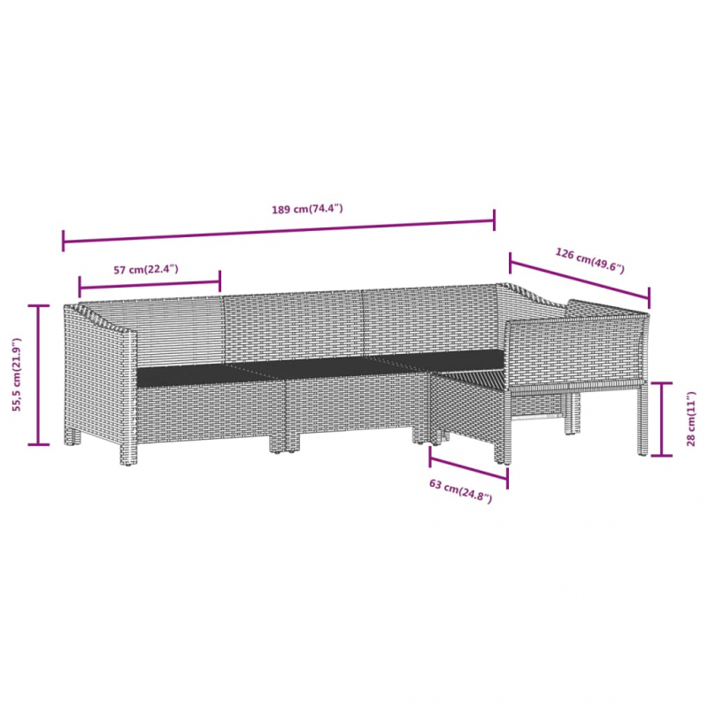 Mit seinem eleganten und modernen Design ist dieses trendige Garten-Lounge-Set eine großartige Wahl zum Entspannen in deinem Garten. Langlebiges Material: PE-Rattan, auch als Poly Rattan bekannt, ist witterungsbeständig und pflegeleicht. Seine Oberfläche weist lange Zeit eine ansprechende Optik auf. Es ist kostengünstiger als andere Materialien und bietet gleichzeitig hohe Qualität, Komfort und einen ästhetisches Look.Stabiler Rahmen: Stahl ist ein außergewöhnlich hartes und starkes Material. Er bietet Robustheit und Stabilität. Die Pulverbeschichtung bildet eine Schutzschicht gegen Abnutzung und Verschleiß.Modulares Design: Jedes Teil lässt sich leicht umstellen, um je nach Bedarf verschiedene Konfigurationen zu erstellen. In unserem Webshop sind auch andere modulare Elemente erhältlich, mit denen du dein eigenes Lounge-Set zusammenstellen kannst.Bequemes Sitzerlebnis: Dank der dick gepolsterten Sitz- und Rückenkissen ist das Outdoor-Lounge-Set sehr bequem. Gut zu wissen:Um die Montage so einfach wie möglich zu machen, wird jedes Produkt mit einer Anleitung geliefert. Hinweis:Damit deine Gartenmöbel lange schön bleiben, empfehlen wir dir, sie mit einer wasserdichten Hülle zu schützen.