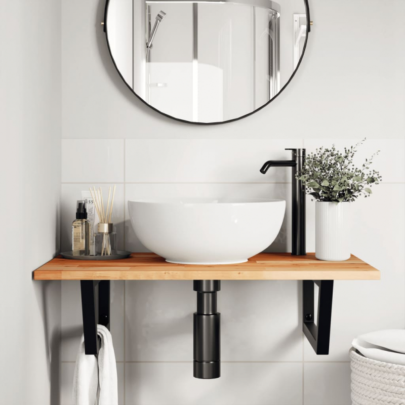 Das Regal lässt sich sicher an der Wand befestigen und bietet eine elegante und platzsparende Lösung für dein Badezimmer. Robust und langlebig: Dieses Waschbeckenregal besteht aus Stahlhalterungen und einer Oberplatte aus massivem Akazienholz, was es robust, stabil und langlebig macht.Platzsparend: Das Schweberegal bietet reichlich Platz für Cremes und Kleinigkeiten. Dank der Trapezform der Halterungen lassen sich auch Handtücher oder andere Sachen platzsparend darauf aufhängen.Einfache Verwendung: Die Holzplatte ist nicht vorgebohrt, sodass dein Waschbecken je nach Bedarf links, rechts oder in der Mitte angebracht werden kann. Dank der vorgebohrten Löcher in der Halterung lässt sich die Ablage am Waschtisch oder an der Wand mühelos befestigen.Vielseitig einsetzbar: Dank ihres modernen Designs schafft die Ablage zusätzlichen Stauraum und fügt sich harmonisch in die unterschiedlichsten Einrichtungen ein. Gut zu wissen:Die Schrauben sind nicht im Lieferumfang enthalten. Du kannst die Schrauben anhand von den folgenden Informationen separat erwerben.Wandbefestigung: 2 x M8-Dehnschraube pro HalterungHolzplatte: 2 x M5x18-Schraube (T=2) oder 2 x M5x20-Schraube (T=2,5/4 cm) pro Halterung