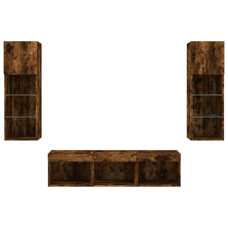 Diese TV-Wandschränke bieten eine perfekte Lösung, um zusätzlichen Stauraum in deinem Wohnraum zu schaffen und für Ordnung zu sorgen. Robustes Material: Holzwerkstoff ist ein Material von außergewöhnlicher Qualität mit glatter Oberfläche, das sich durch Festigkeit, Stabilität und Feuchtigkeitsbeständigkeit auszeichnet.RGB-LED-Leuchten: Die Wohnwand ist mit lebendigen RGB-LED-Leuchten ausgestattet. Mit verschiedenen anpassbaren Menüs kannst du die Farbe der Lichter mühelos wechseln und sie sogar auf automatische Anpassung einstellen. Diese LED-Leuchten unterstreichen nicht nur den modernen Look des TV-Wandschranks, sondern tragen auch zu seiner trendigen Optik bei.Wandmontage: Der TV-Schrank lässt sich an der Wand montieren, um zusätzlichen Stauraum zu schaffen. Auf diese Weise kannst du deine Bodenfläche maximieren und für Ordnung im Raum sorgen.Reichlich Stauraum: Das TV-Wandschrank-Set bietet reichlich Platz, um Bücher, DVDs, Zeitschriften, Medien und andere Alltagsgegenstände übersichtlich und griffbereit zu verstauen.Vielseitiges Design: Du kannst den Schrank als TV-Schrank verwenden oder ihn im Arbeitszimmer an der Wand montieren, um Utensilien oder andere Gegenstände bequem aufzubewahren. Zudem verwandelt er eine leere Wand sofort in ein Design-Element. Gut zu wissen:Schrauben und Dübel für die Innenseite der Wand sind nicht enthalten. Wir empfehlen dir, Schrauben und Dübel zu finden und zu verwenden, die speziell für deine Wände geeignet sind. Wenn du dir nicht sicher bist, kannst du dich an einen Fachmann wenden. Bitte lies und befolge jeden Schritt in der Anleitung.Das Produkt verfügt über einen USB-Anschluss, für den eine zertifizierte 5V-USB-Stromquelle erforderlich ist (nicht im Lieferumfang enthalten).