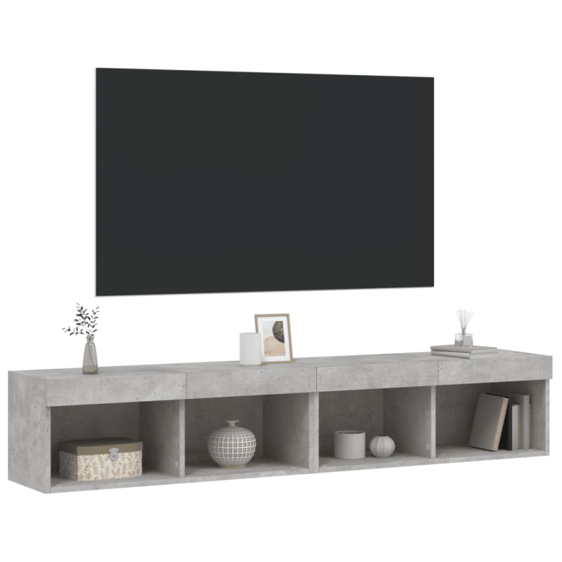 Mit ihrem trendigen und dennoch praktischen Design werden diese TV-Schränke mit LED-Leuchten echte Hingucker in deinem Zimmer sein. Langlebiges Material: Holzwerkstoff ist ein Material von außergewöhnlicher Qualität mit glatter Oberfläche, das sich durch Festigkeit, Stabilität und Feuchtigkeitsbeständigkeit auszeichnet. Aus Holzwerkstoff gefertigt, sind diese TV-Schränke robust und langlebig.Reichlich Stauraum: Die TV-Schränke bieten reichlich Stauraum, um DVD-Player, Empfänger, CDs und andere Kleinigkeiten gut organisiert und in Reichweite aufzubewahren.RGB-LED-Leuchten: Diese TV-Schränke sind mit RGB-LED-Leuchten ausgestattet, die über verschiedene Menüs verfügen, um die Farbe der Lichter zu wechseln und sie automatisch einzustellen.Wandmontage: Diese TV-Schränke lassen sich an der Wand montieren, um zusätzlichen Stauraum zu schaffen. Auf diese Weise kannst du deine Bodenfläche maximieren und für Ordnung im Raum sorgen. Gut zu wissen:Schrauben und Dübel für die Innenseite der Wand sind nicht enthalten. Wir empfehlen dir, Schrauben und Dübel zu finden und zu verwenden, die speziell für deine Wände geeignet sind. Wenn du dir nicht sicher bist, kannst du dich an einen Fachmann wenden. Bitte lies und befolge jeden Schritt in der Anleitung.Das Produkt verfügt über einen USB-Anschluss, für den eine zertifizierte 5V-USB-Stromquelle erforderlich ist (nicht im Lieferumfang enthalten).