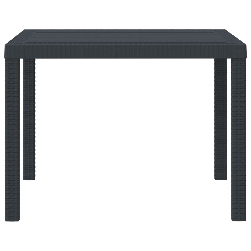 Dieser Tisch für die Terrasse verbindet modernes Design mit Funktionalität und macht deine Zusammenkünfte im Freien super einfach. Mit robusten, wetterfesten Materialien ist er der perfekte Ort, um im Garten zu essen oder einen Kaffee zu genießen. Leichtes Design: Der Tisch lässt sich super leicht bewegen, was ihn ideal für deinen Außenbereich macht. Wetterfest: Hergestellt aus Kunststoff, hält er allem stand, was das Wetter bringt und bleibt dabei stylisch. Modernes Aussehen: Die glatte quadratische Form und die anthrazitfarbene Farbe bringen zeitgenössischen Flair auf deine Terrasse, passend zu jedem Stil. Einfach zu reinigen: Ein Wisch mit einem feuchten Tuch reicht aus, um diesen Tisch toll aussehen zu lassen. Perfekt für Zusammenkünfte: Er bietet Platz für vier Personen und ist das ideale Zentrum für Outdoor-Dinner, von BBQs bis schickeren Mahlzeiten.