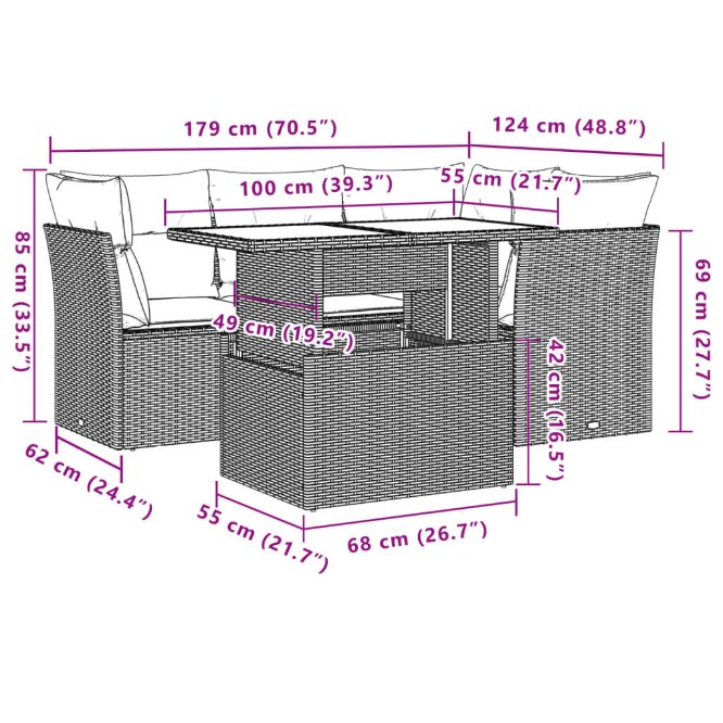 Diese Garten-Sofagarnitur ist die perfekte Ergänzung zu deinem Garten, deiner Terrasse oder deinem Innenhof. Sie bietet einen bequemen und einladenden Platz, um mit Familie und Freunden zu plaudern oder dich einfach nur zu entspannen und das Leben im Freien zu genießen. Langlebiges Material: PE-Rattan, auch als Poly Rattan bekannt, ist ein robustes, pflegeleichtes synthetisches Material, das die Optik von natürlichem Rattan aufweist. Es kennzeichnet sich durch ein geringes Eigengewicht und lässt sich einfach reinigen. Aufgrund seiner Haltbarkeit und Witterungsbeständigkeit wird es häufig bei der Herstellung von Gartenmöbeln verwendet.Verstellbare Tischplatte: Die Tischplatte lässt sich anheben, um den Gartentisch höher zu machen und ihn von einem Couchtisch in einen Esstisch zu verwandeln. Er eignet sich daher perfekt für Gäste oder Mahlzeiten im Freien.Bequemes Sitzerlebnis: Dieser Gartensessel mit dick gepolsterten Kissen bietet ein angenehmes Sitzgefühl.Abnehmbarer und waschbarer Bezug: Diese Sitzkissen verfügen über abnehmbare Bezüge für einfaches Waschen und Pflegen.Modulares Design: Dank des modularen Designs lassen sich die Gartenmöbel völlig flexibel und einfach umstellen, um deinen Außenbereich ganz individuell zu gestalten. Gut zu wissen:Wir empfehlen dir, deine Gartenmöbel mit einer wasserdichten Hülle zu schützen, um lange Zeit eine ansprechende Optik aufzuweisen.