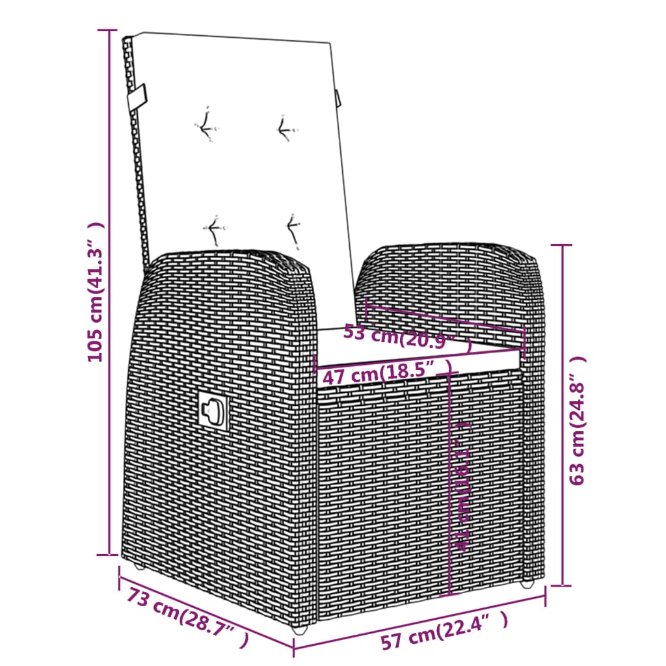 - Stuhlmaße (in Sitzposition): 57 x 73 x 105 cm (B x T x H)