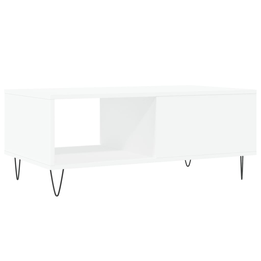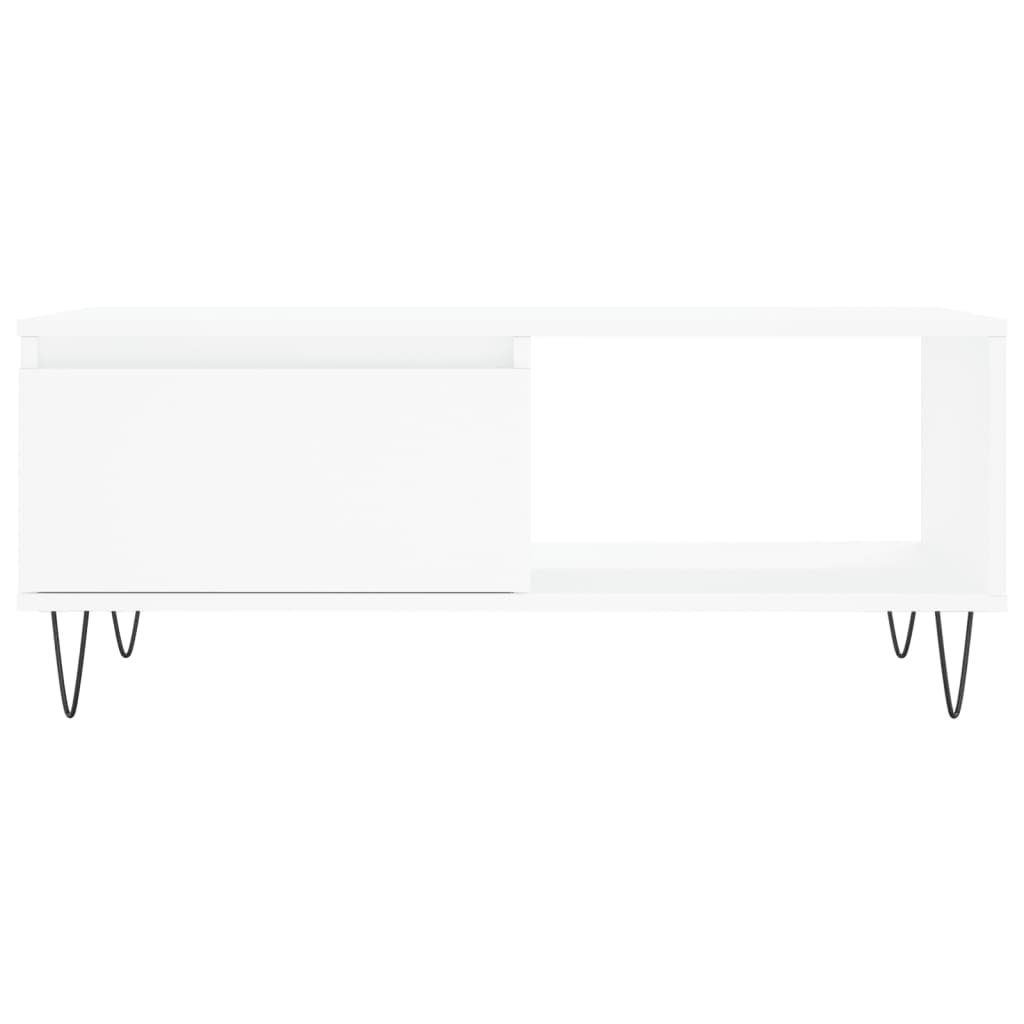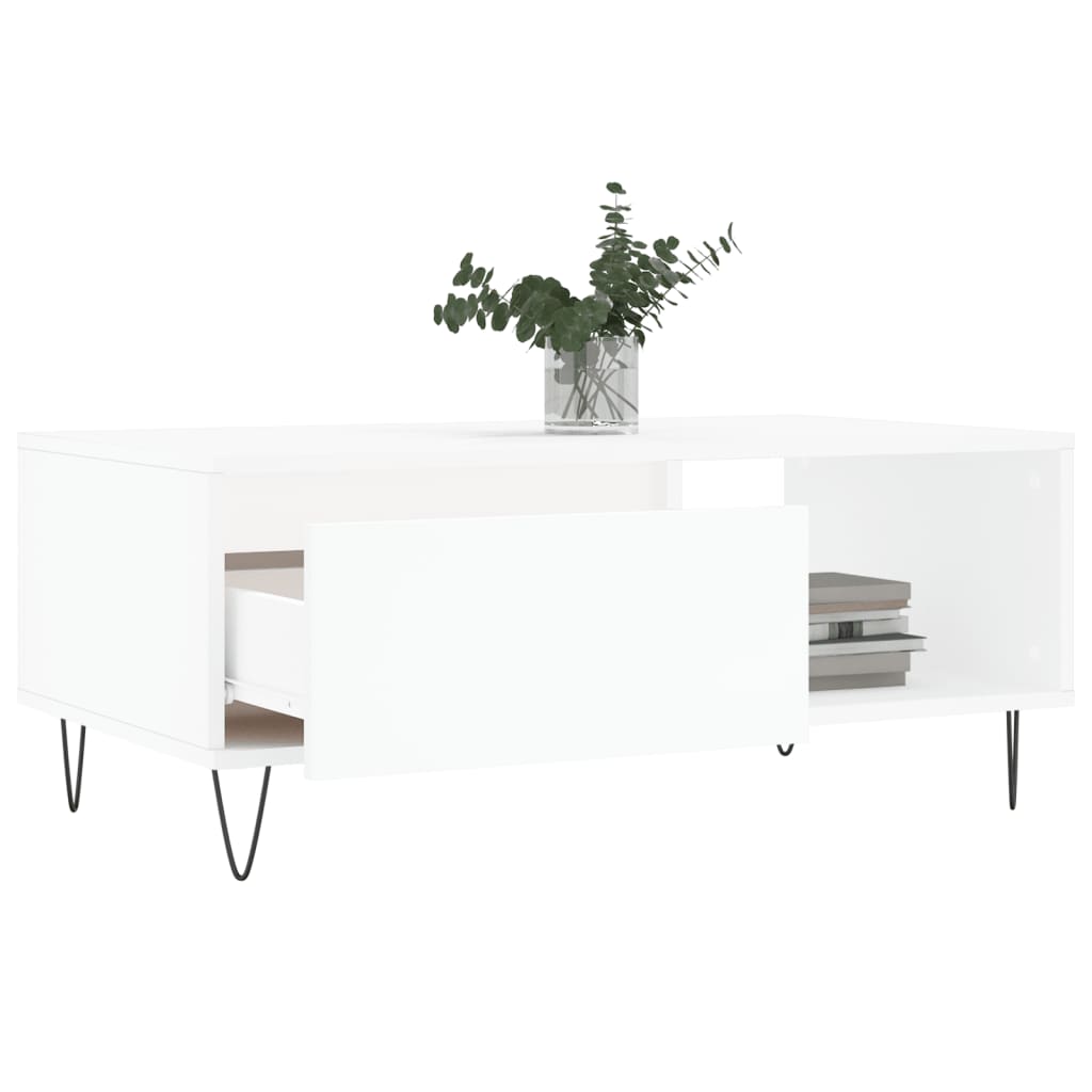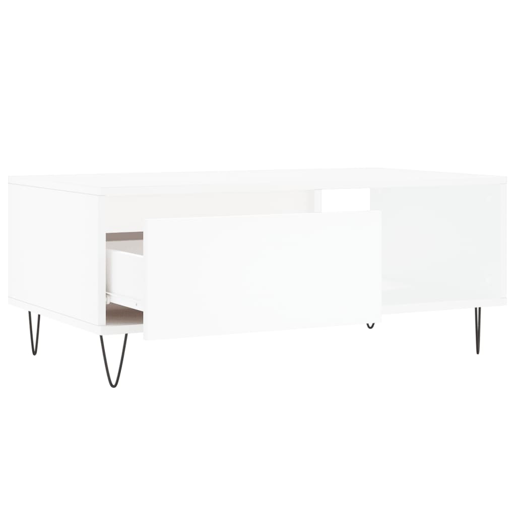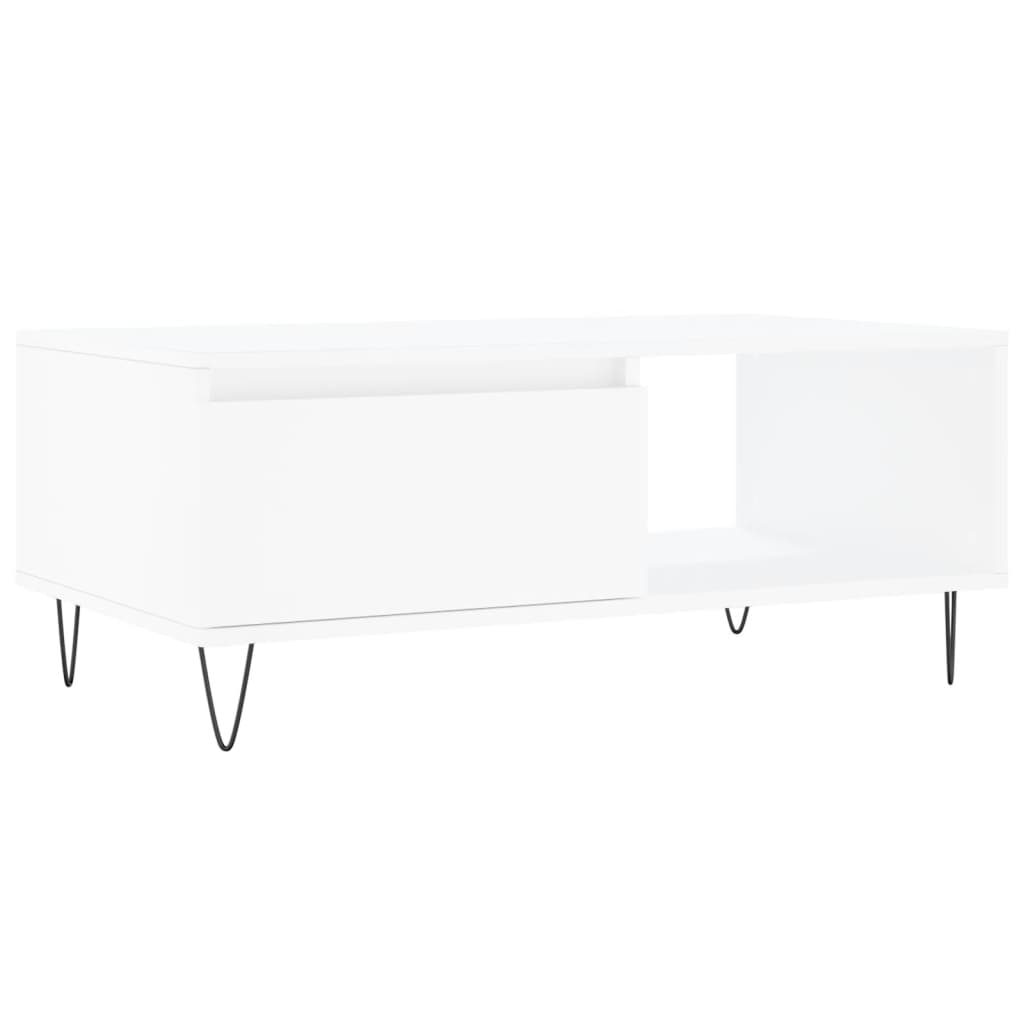 Bringe einen Hauch Eleganz in dein Wohnzimmer mit diesem stilvollen Couchtisch. Langlebiges Material: Holzwerkstoff ist ein Material von außergewöhnlicher Qualität mit glatter Oberfläche, das sich durch Festigkeit, Stabilität und Feuchtigkeitsbeständigkeit auszeichnet. Aus Holzwerkstoff gefertigt, lässt sich der Beistelltisch mit einem feuchten Tuch leicht reinigen.Reichlich Stauraum: Dieser Sofatisch bietet mit einer Schublade und einem Fach reichlich Stauraum, um verschiedene wichtige Sachen ordentlich und griffbereit aufzubewahren.Robuste Tischplatte: Die robuste Tischplatte bietet den perfekten Platz für Getränke, Snacks und einige Dekoartikel.Metallbeine: Die Metallbeine verleihen Ihrem Interieur eine moderne und angenehme Note und sorgen gleichzeitig für Stabilität.