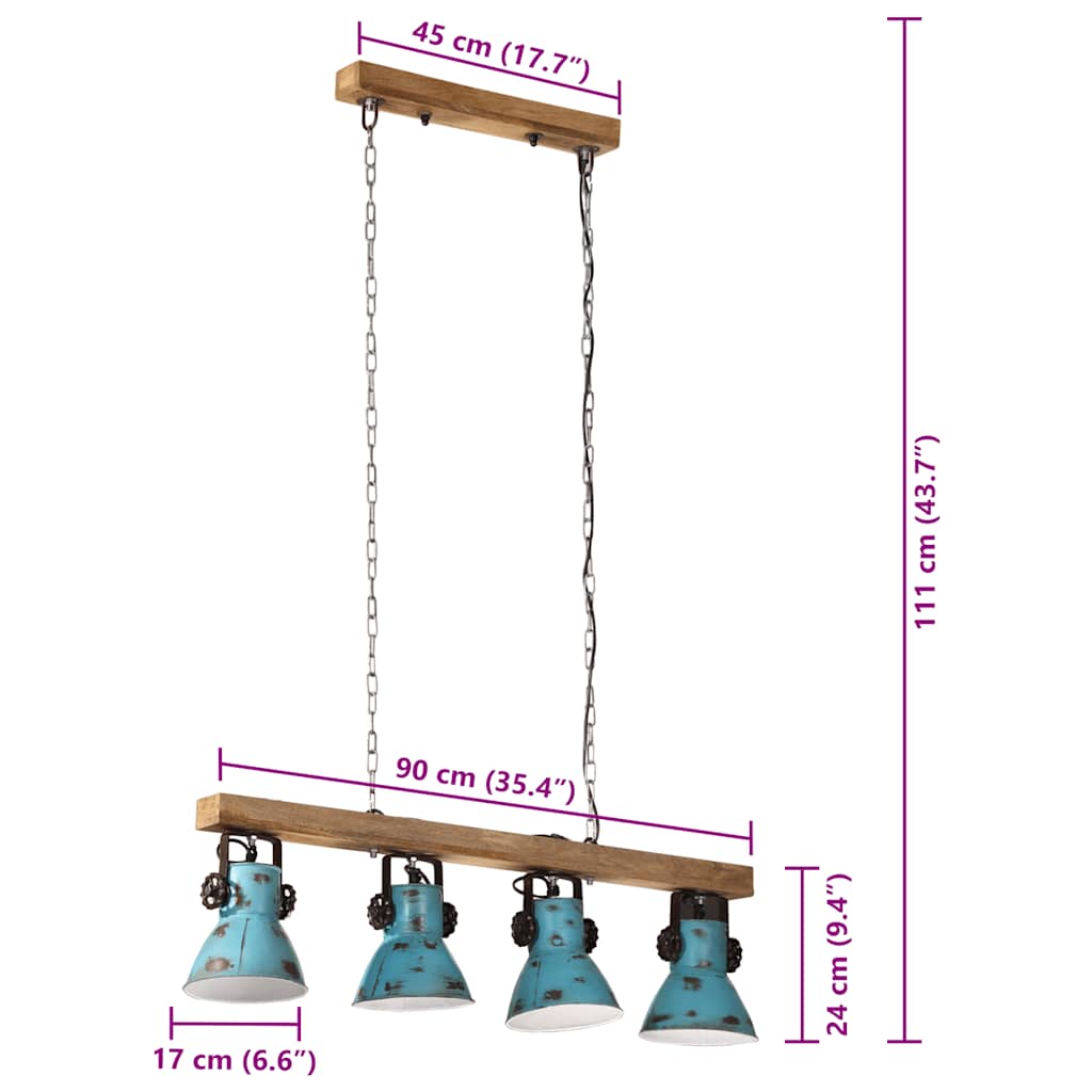 Diese Deckenleuchte wird definitiv ein Hingucker im Wohnzimmer, Esszimmer, Büro und mehr. Robust und stabil: Massives Mangoholz ist ein starkes, tropisches Hartholz, aus dem robuste Möbelstücke hergestellt werden. Die optisch ansprechende Holzmaserung macht jedes Stück zu einem Unikat. Handbemalt: Da jedes Stück handgefertigt und einzigartig ist, können die Farben von Produkt zu Produkt variieren. 4-flammig: Die 4-flammige Hängeleuchte verfügt über vier E27-Fassungen für Leuchtmittel von maximal 25 Watt. Du kannst E27-Glühbirnen mit verschiedenen Lichtfarben auswählen, um eine Atmosphäre der Entspannung und Erholung zu schaffen. Industrial Style: Dank des Lampenschirms aus Eisen und des Finish in Blau passt die Lampe perfekt in ein Interieur im Landhaus- oder Industrie-Stil. Gut zu wissen:Diese Lampe im Industrie-Stil weist verschiedene Unvollkommenheiten und eine raue Optik auf, die ihr einen eigenen Charakter verleihen und sie zum Unikat machen. Leuchtmittel sind nicht im Lieferumfang enthalten.