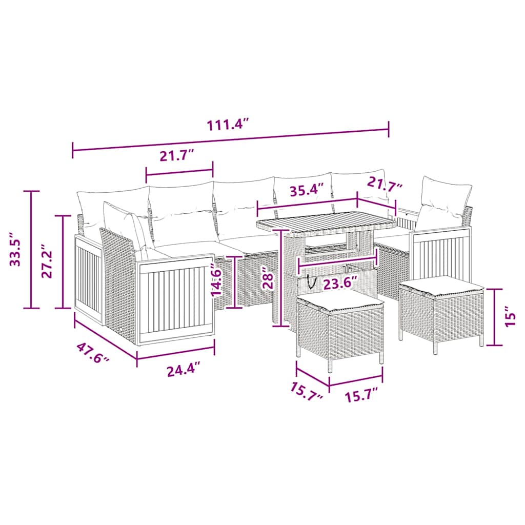 Das Modern Garden Sofa Set ist perfekt, um deinen Garten oder die Terrasse aufzuwerten. Es bietet eine schicke und flexible Sitzlösung für draußen. Mit seinem minimalistischen Stil und der funktionalen Gestaltung verleiht es jeder Outdoor-Veranstaltung einen Hauch von Eleganz. Materialien: Das Set besteht aus einer smarten Kombination von Poly-Rattan und pulverbeschichtetem Stahl, die modern aussieht und gleichzeitig robust ist. Das Poly-Rattan gibt dem Möbelstück seinen trendy Look und sorgt für Langlebigkeit, während der pulverbeschichtete Stahl eine solide Basis bietet, die perfekt für draußen ist. Enthaltene Komponenten: Dieses Set hat vier Armsofas, drei Mittelsitze, zwei Hocker und einen praktischen Tisch, der all deinen Anforderungen gerecht wird. Betrachtet man die Armlehnen und Tischplatten aus massivem Akazienholz, bietet es eine natürliche Schönheit und angenehme Oberflächen. Funktionen /Design: Mit strapazierfähigen, UV-beständigen Materialien hält das Set auch intensiver Sonneneinstrahlung stand, ohne an Qualität zu verlieren. Zudem ist die modulare Bauweise klasse, da sie dir die Möglichkeit gibt, das Set nach deinen Bedürfnissen umzuformen. Es ist leicht und lässt sich einfach bewegen – perfekt für einen dynamischen Außenbereich. Empfohlene Verwendungszwecke: Ideal für Gärten und Terrassen, passt sich dieses Set von einem entspannten Kaffeekränzchen bis zu ausgelassenen Gartenpartys an. Dank seines flexiblen Designs ist es sowohl für intime Zusammenkünfte als auch für große Feiern super geeignet – ein Must-have für jeden Außenunterhalter. Pflege & Wartung: Damit dieses Set auch langfristig schön bleibt, mach es dir einfach: benutze Schutzhüllen, wenn du es nicht brauchst – besonders bei schlechtem Wetter. Wisch regelmäßig die Holz- und Rattanoberflächen mit einem trockenen Tuch ab – so bleibt der Look immer frisch und ansprechend.