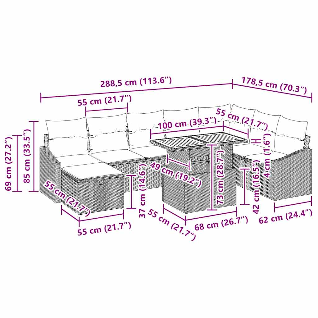 Dieses moderne Garten-Sofa-Set ist die perfekte, vielseitige Lösung für entspannte Stunden oder gesellige Abende im Freien. Das modulare Konzept erlaubt dir, die Anordnung ganz nach deinen Bedürfnissen zu gestalten. Egal ob beim Familien-Barbecue, beim Lesen oder bei einem Treffen mit Freunden – die Kombination aus attraktivem Design und nützlichen Funktionen macht dieses Set zum Herzstück für jeden Garten oder jede Terrasse. Materialien Das Set besteht aus Poly-Rattan und massivem Akazienholz und steht für Robustheit und Stil. Das Poly-Rattan ist super haltbar und UV-beständig, während das massive Akazienholz einen natürlichen Look hat, der perfekt für jedes Outdoor-Setting ist. Inklusive Komponenten Das Set enthält alles, was du brauchst: vier Mittelplätze, eine Ecken-Sitzgelegenheit, zwei Armsofas, einen Fußhocker und einen höhenverstellbaren Tisch. Jedes Teil trägt dazu bei, das Set vielseitig und funktional zu machen – ideal zum Essen oder Relaxen. Eigenschaften / Funktion / Design Der höhenverstellbare Tisch sorgt für einen nahtlosen Wechsel zwischen Kaffeetisch und Speisetisch. Mit wetterfesten und UV-beständigen Eigenschaften bleibt das Set auch langfristig schön. Empfohlene Nutzung Perfekt für Gärten oder Terrassen: dieses moderne Sofa-Set eignet sich super für persönliche Entspannung und geselliges Beisammensein. Das modulare Design kommt in verschiedensten Situationen zum Einsatz, von sonnigen Brunches bis zu abendlichen Feiern. Pflege und Wartung Um die Langlebigkeit zu gewährleisten, decke das Set ab, wenn du es nicht brauchst. Verwende keine aggressiven Chemikalien, wische die Oberflächen einfach mit einem weichen Tuch ab, um die Möbel TOP in Schuss zu halten.