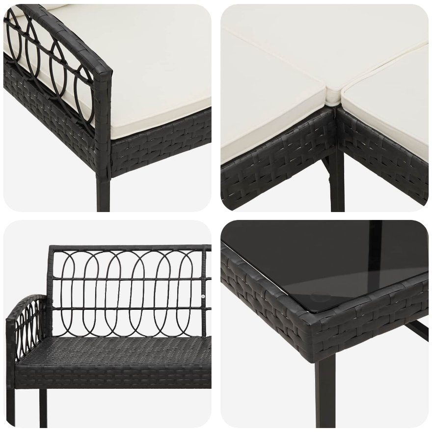 Dieses moderne Garten-Sofaset verwandelt dein Leben im Freien mit seinem klaren Design und der robusten Bauweise. Es bereichert deinen Garten, deine Terrasse und Poolbereiche – perfekt für entspannte Gespräche oder ruhige Abende im Freien. Mit seiner stilvollen und gleichzeitig funktionalen Silhouette ist es ein echter Hingucker in deiner Outdoor-Deko, egal ob beim Grillen oder unter dem Sternenhimmel. Robuste Bauweise: Das Sofaset aus Poly-Rattan und Stahl ist stabil und für den täglichen Einsatz im Freien gemacht. Diese wetterfeste Kombi sorgt dafür, dass die Möbel allen Wetterbedingungen trotzen und lange halten. Glasoberflächen: Der Tisch mit gehärteter Glasoberfläche bietet nicht nur eine schicke, sondern auch pflegeleichte Fläche für Speisen oder Deko. Das Glas ist sicher verarbeitet, um Stöße und Verschüttungen zu vermeiden und vereint Funktionalität mit Stil für deine Outdoor-Veranstaltungen. Poliesterkissen: Mit den weichen, wetterfesten Polyesterkissen bietet dieses Set hervorragenden Komfort und hält mehrere Saisons lang. Die Kissen sind schimmelresistent und verblassen nicht, sodass du lange Freude daran hast. Flexible Anordnung: Das modulare Design ermöglicht dir, das Set nach deinen Wünschen anzuordnen, egal ob für intime Gespräche oder große Feiern. Die L-Form nutzt den Platz optimal aus und schafft Flexibilität im Außenbereich. Pflegehinweise: Mit abnehmbaren Kissenbezügen ist die Reinigung ein Kinderspiel und hält deine Möbel frisch. Wische die Metall- und Glasoberflächen regelmäßig mit einem milden Reiniger ab, damit sie auch in Zukunft toll aussehen.