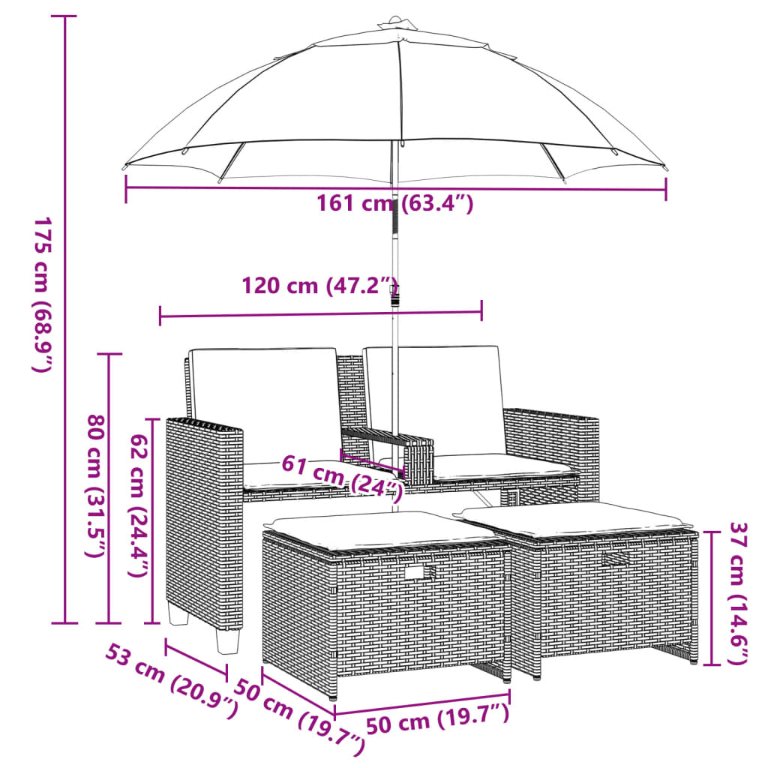 Dieses Outdoor-Sofa mit Sonnenschirm und Hockern ist die perfekte Ergänzung zu deinem Garten, deiner Terrasse oder deinem Innenhof. Er bietet einen bequemen und einladenden Platz, um mit Familie und Freunden zu plaudern oder einfach nur zu relaxen und das Leben im Außenbereich zu genießen. Langlebiges Material: PE-Rattan, auch als Poly Rattan bekannt, ist ein robustes, pflegeleichtes synthetisches Material, das die Optik von natürlichem Rattan aufweist. Es kennzeichnet sich durch ein geringes Eigengewicht und lässt sich einfach reinigen. Aufgrund seiner Haltbarkeit und Witterungsbeständigkeit wird es häufig bei der Herstellung von Gartenmöbeln verwendet.Praktischer Sonnenschirm: Das Gartensofa verfügt über einen Sonnenschirm mit Kippmechanismus, der sich einfach verstellen lässt, um in jedem Winkel Schatten und Schutz vor der Sonne zu bieten.Abnehmbarer und waschbarer Bezug: Diese Kissen haben abnehmbare Bezüge für einfache Reinigung und Pflege.Kompakte Aufbewahrung: Die Fußhocker können platzsparend unter den Sitzen verstaut werden.Robuster und stabiler Rahmen: Dank des pulverbeschichteten Stahlrahmens ist das Möbelstück robust, stabil und für den täglichen Einsatz im Außenbereich geeignet. Gut zu wissen:Wir empfehlen dir, deine Gartenmöbel mit einer wasserdichten Hülle zu schützen, um lange Zeit eine ansprechende Optik aufzuweisen.
