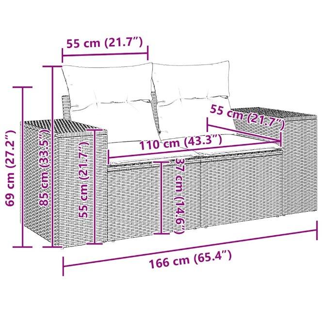 Entspannen Sie sich und genießen Sie die Natur auf diesem bequemen 2-Sitzer-Gartensofa! Langlebiges Material: PE-Rattan, auch bekannt als Polyrattan, ist ein robustes, pflegeleichtes Kunststoffmaterial, das wie natürliches Rattan aussieht. Es ist leicht, einfach zu reinigen und wird aufgrund seiner Langlebigkeit und Wetterbeständigkeit häufig für Gartenmöbel verwendet.Bequemes Sitzerlebnis: Diese Gartenmöbel mit dick gepolsterten Kissen bieten ein komfortables Sitzerlebnis. Die breiten Armlehnen bieten außerdem einen praktischen Platz, um Ihr Mobiltelefon, Tassen oder andere kleine Gegenstände in Reichweite abzustellen.Abnehmbarer und waschbarer Bezug: Diese Sitzkissen verfügen über abnehmbare Bezüge zum einfachen Waschen und Pflegen.Modulares Design: Dieses Gartenmöbelset hat ein modulares Design, wodurch es völlig flexibel und leicht zu bewegen ist, sodass Sie eine individuelle Gartenmöbelanordnung erstellen können. Gut zu wissen:Damit Ihre Gartenmöbel schön bleiben, empfehlen wir Ihnen, sie mit einer wasserdichten Abdeckung zu schützen.