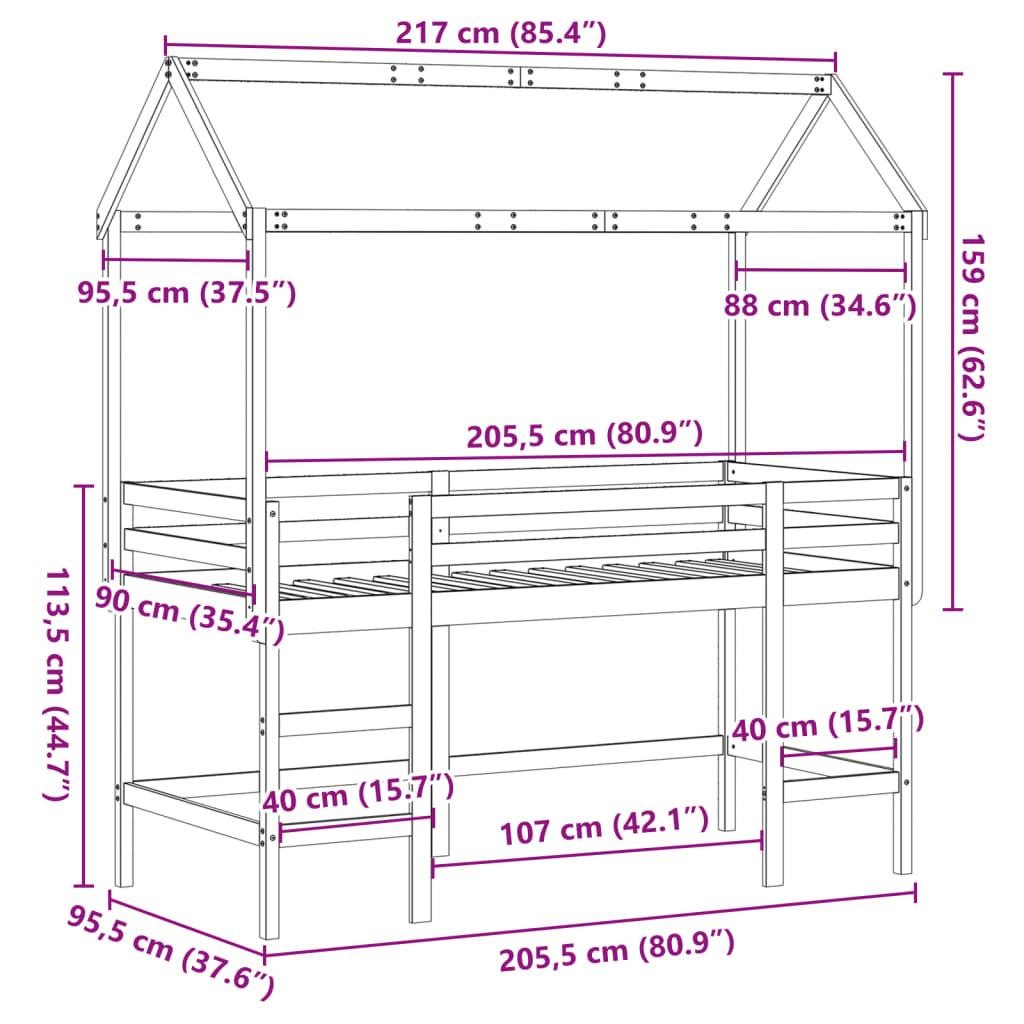 Dieses Hochbett für Kinder wurde aus Kiefern-Massivholz gefertigt und ist sowohl zur Unterhaltung als auch zur Raumoptimierung konzipiert worden. Massives Kiefernholz: Massives Kiefernholz ist ein wunderschönes Naturmaterial. Kiefernholz weist eine gerade Maserung auf und die Aststellen verleihen dem Material seine charakteristische, rustikale Optik.Volle Raumausnutzung: Dieses Einzel-Hochbett ist 78,5 cm über dem Boden angebracht und bietet darunter ausreichend Platz für allerlei Sachen oder spielerische Aktivitäten. Dieser Bereich kann zum Stapeln von Aufbewahrungsboxen, zum Aufbewahren großer Spielsachen oder sogar zum Aufstellen eines Kindersofas genutzt werden. Darüber hinaus kann dein Kind den Raum unter diesem Kinderbett als geheimen Ort nutzen und fantasievolles Spielen genießen.Sicherheitsgeländer: Das Etagenbett für Kinder ist an allen 4 Seiten mit Rausfallschutz ausgestattet, sodass Kinder nicht herausfallen können.Praktische Leiter: Dieses Hochbett für Kinder verfügt über eine Leiter, die das Ein- und Aussteigen erleichtert. Es macht auch Freude und verwandelt dein Zimmer in einen Spielplatz.Offene Seite: Das Dach verfügt über eine offene Seite, die den Kindern den Ein- und Ausstieg erleichtert, Gut zu wissen:Bei diesem Bett ist keine Matratze im Lieferumfang enthalten. Wir bieten jedoch eine große Auswahl an Matratzen an. Du kannst in unserem Shop nach einer passenden Matratze suchen. Achtung:Um ein Umkippen zu vermeiden, sollte dieses Produkt mit der mitgelieferten Wandhalterung gesichert werden.