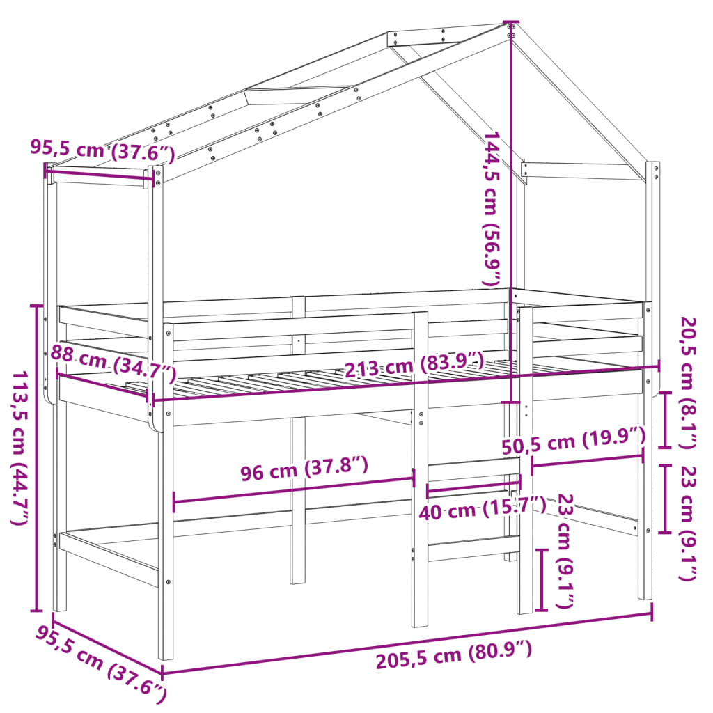 Dieses Hochbett für Kinder wurde aus Kiefern-Massivholz gefertigt und ist sowohl zur Unterhaltung als auch zur Raumoptimierung konzipiert worden. Massives Kiefernholz: Massives Kiefernholz ist ein wunderschönes Naturmaterial. Kiefernholz weist eine gerade Maserung auf und die Aststellen verleihen dem Material seine charakteristische, rustikale Optik.Volle Raumausnutzung: Dieses Einzel-Hochbett ist 78,5 cm über dem Boden angebracht und bietet darunter ausreichend Platz für allerlei Sachen oder spielerische Aktivitäten. Dieser Bereich kann zum Stapeln von Aufbewahrungsboxen, zum Aufbewahren großer Spielsachen oder sogar zum Aufstellen eines Kindersofas genutzt werden. Darüber hinaus kann dein Kind den Raum unter diesem Kinderbett als geheimen Ort nutzen und fantasievolles Spielen genießen.Sicherheitsgeländer: Das Etagenbett für Kinder ist an allen 4 Seiten mit Rausfallschutz ausgestattet, sodass Kinder nicht herausfallen können.Praktische Leiter: Dieses Hochbett für Kinder verfügt über eine Leiter, die das Ein- und Aussteigen erleichtert. Es macht auch Freude und verwandelt dein Zimmer in einen Spielplatz.Offene Seite: Das Dach verfügt über eine offene Seite, die den Kindern den Ein- und Ausstieg erleichtert, Gut zu wissen:Bei diesem Bett ist keine Matratze im Lieferumfang enthalten. Wir bieten jedoch eine große Auswahl an Matratzen an. Du kannst in unserem Shop nach einer passenden Matratze suchen. Achtung:Um ein Umkippen zu vermeiden, sollte dieses Produkt mit der mitgelieferten Wandhalterung gesichert werden.