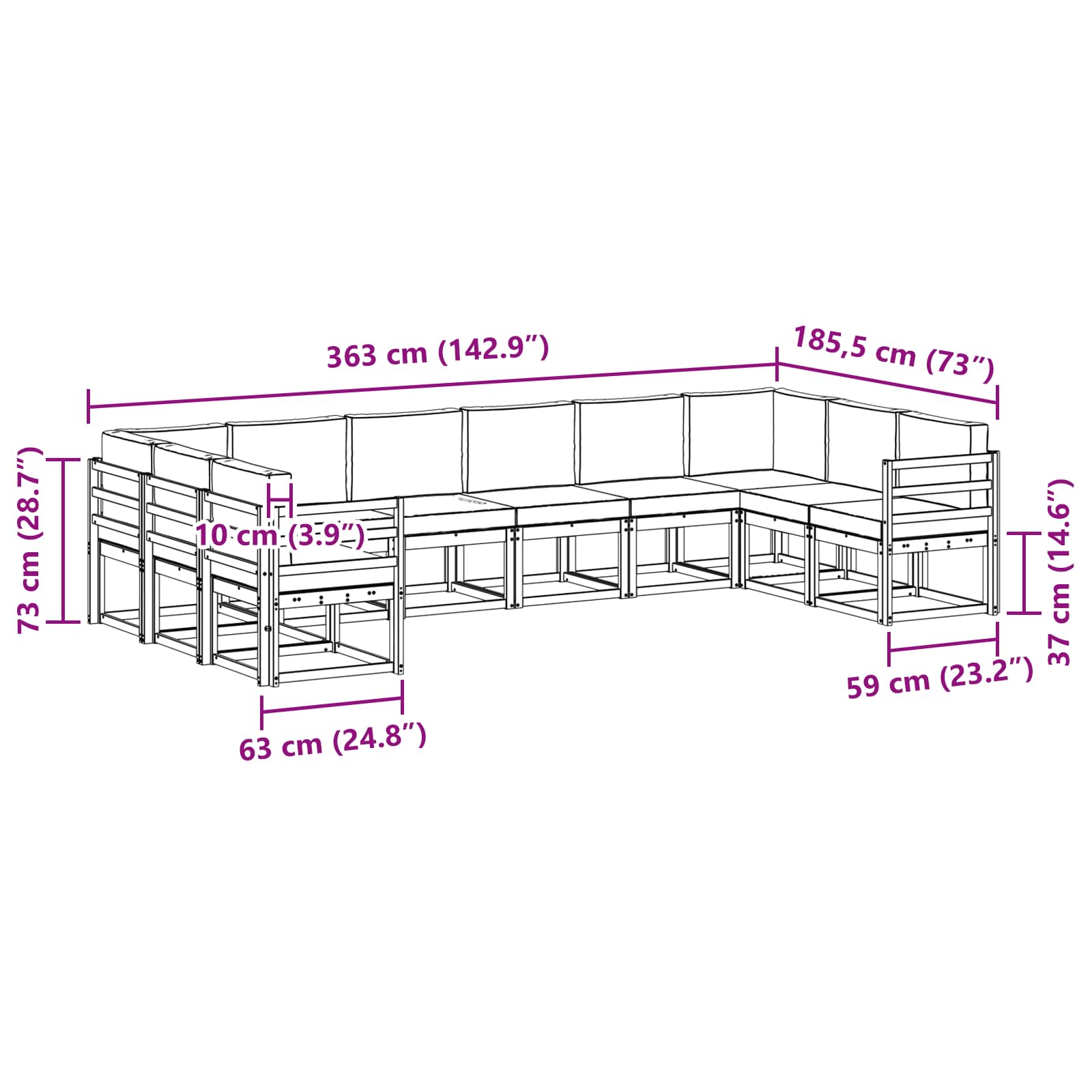 - Gesamtabmessungen: 363 x 185,5 x 73 cm (L x B x H)