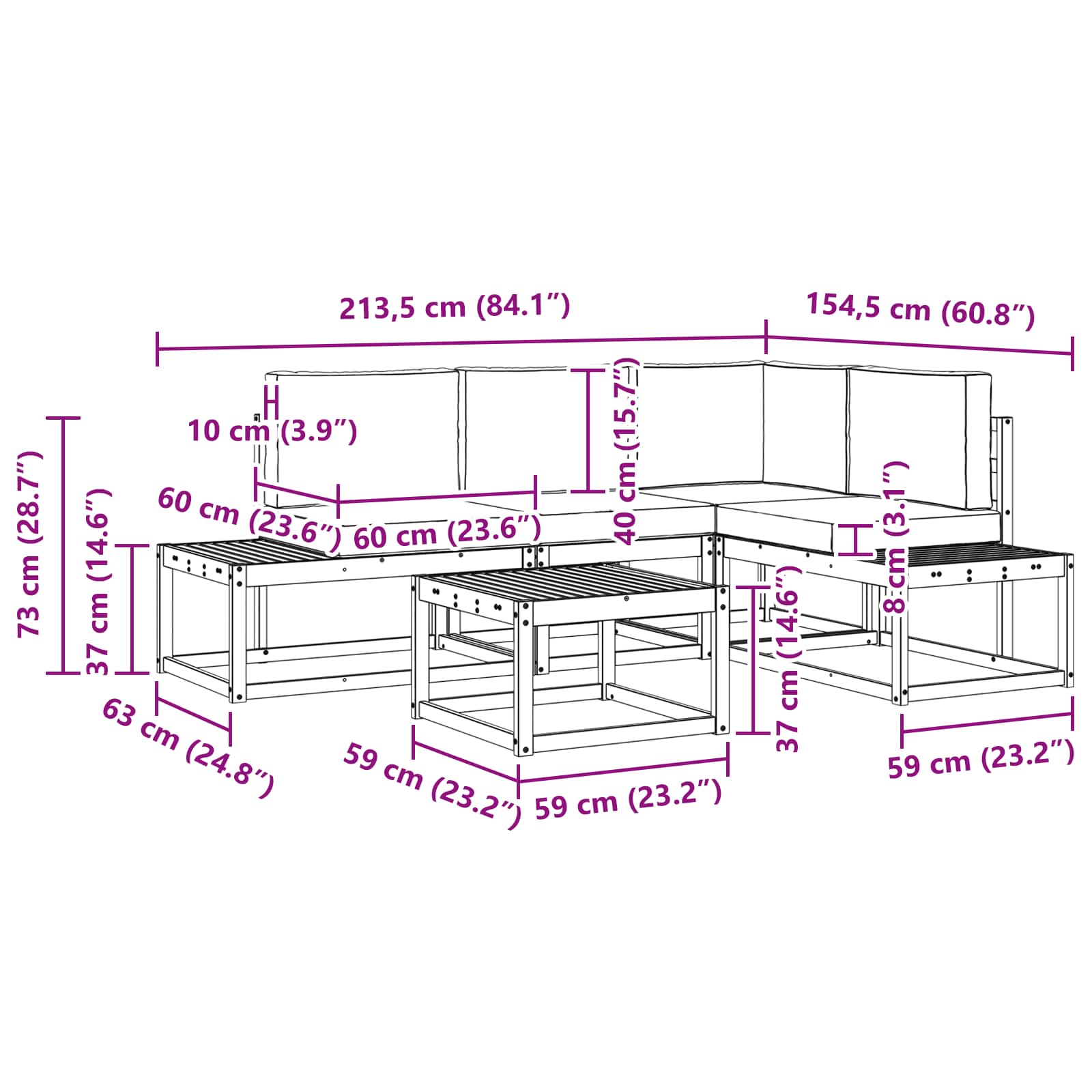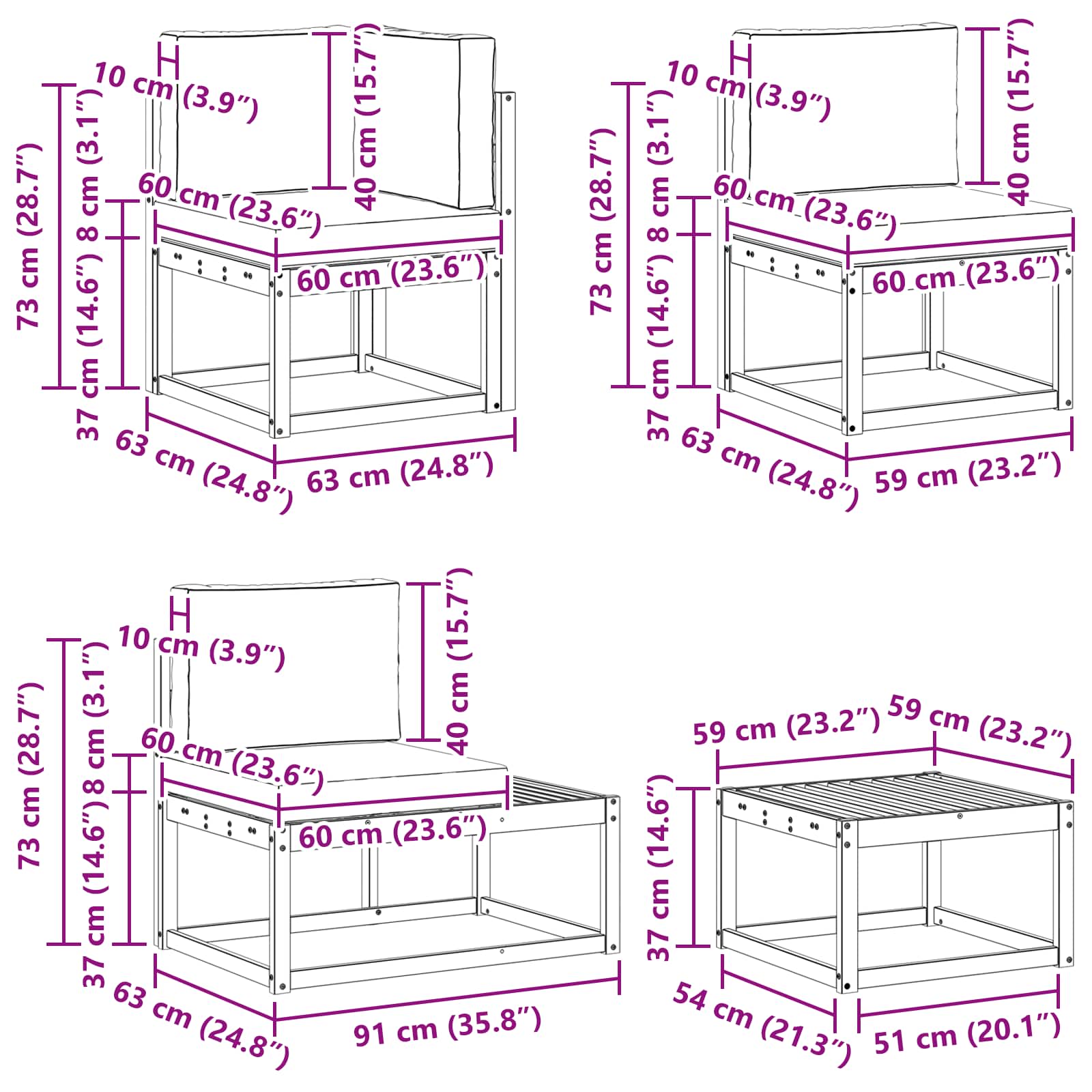 - 2 x End Seat: 91 x 63 x 73 cm (L x W x H)