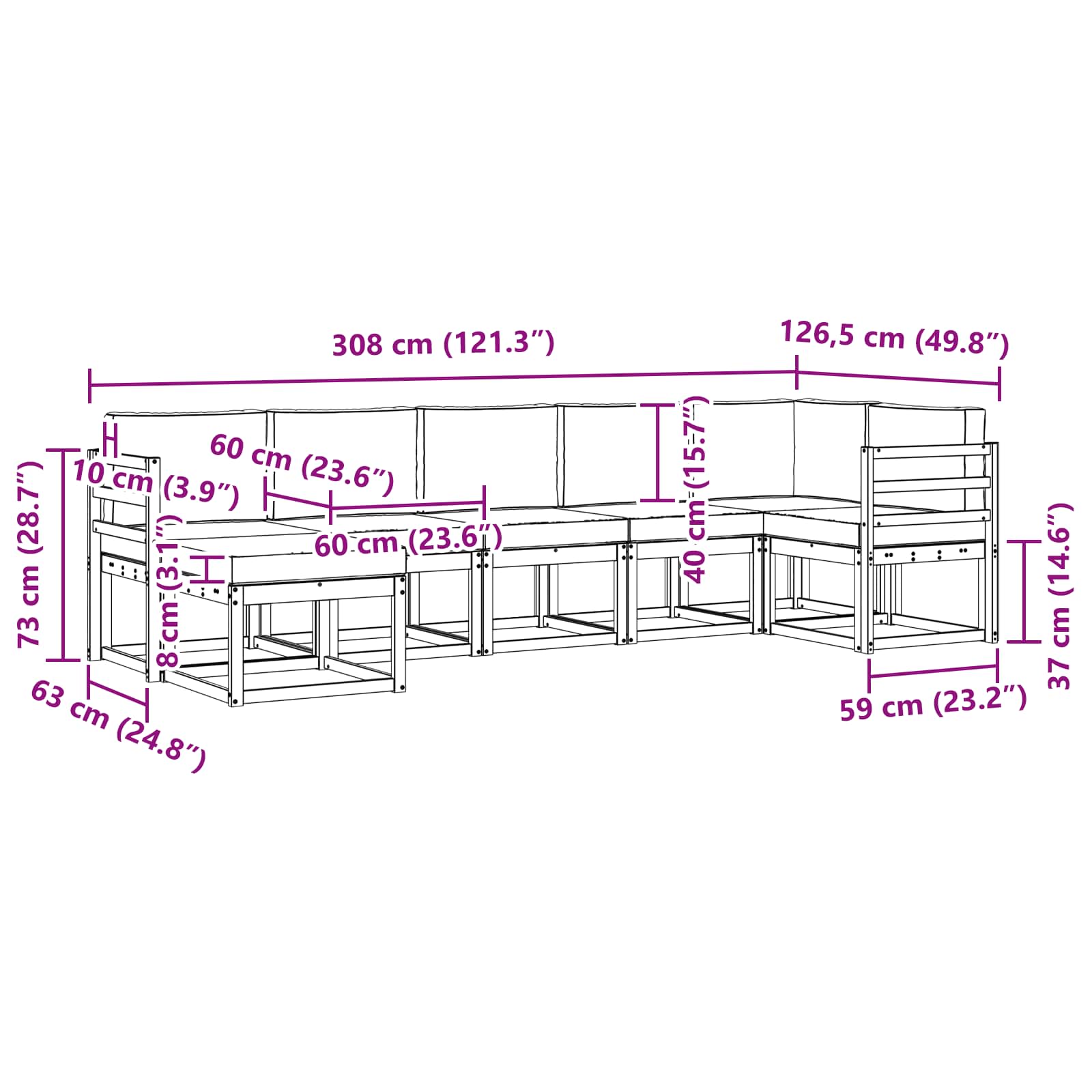 - Gesamtabmessungen: 308 x 126,5 x 73 cm (L x B x H)