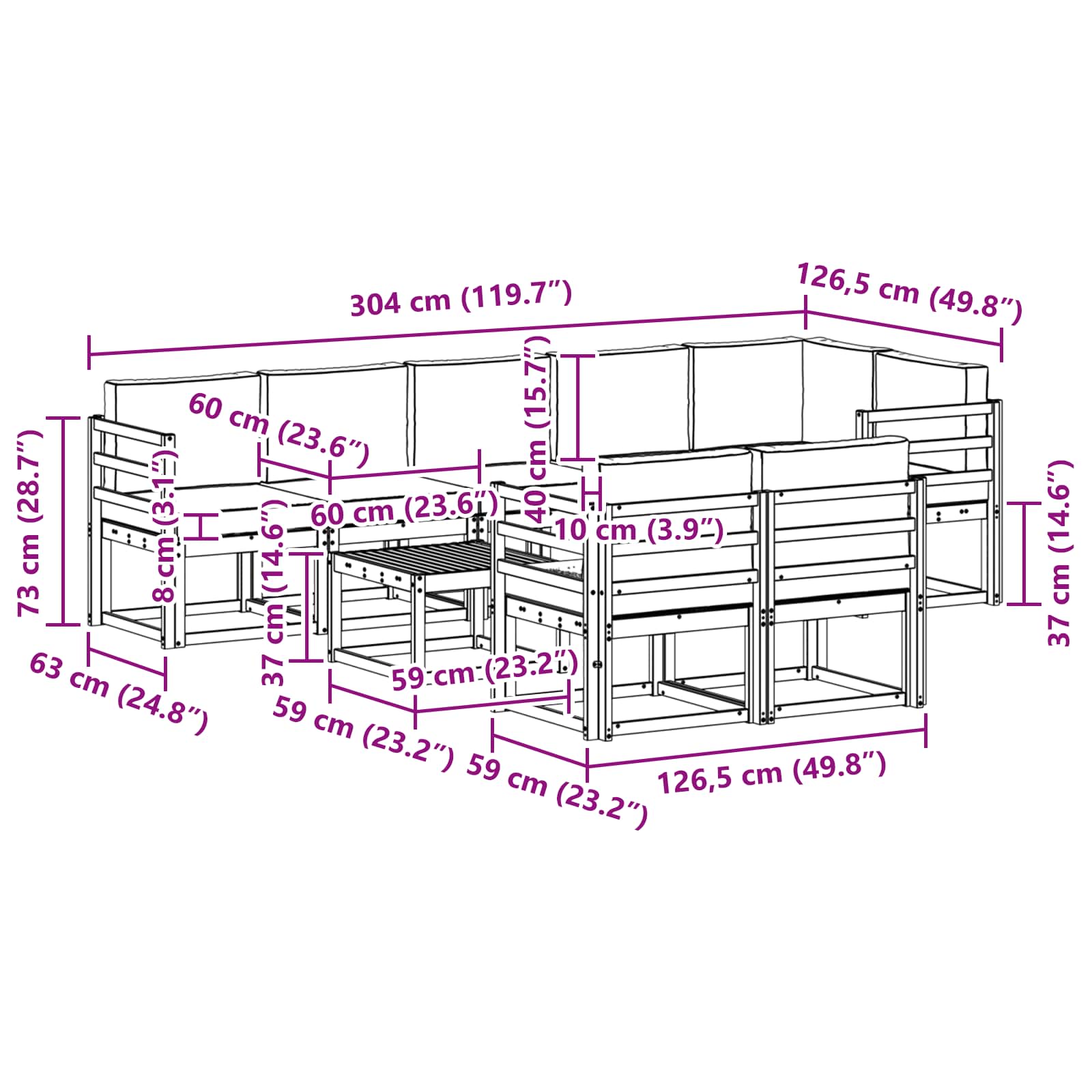 - 7 x Mittelsitz: 59 x 63 x 73 cm (L x B x H)