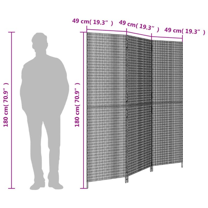 Dekoriere dein Zuhause und teile deinen Raum mit diesem Paravent aus Poly Rattan auf Langlebig und pflegeleicht: Der Paravent ist aus wetterbeständigen und langlebigen Streifen aus Poly Rattan geflochten, was ihm eine ansprechende Optik verleiht. Zudem lässt er sich auch einfach reinigen.Robust: Die pulverbeschichtete Stahlrahmen sorgen für Robustheit und Stabilität.Flexibles Faltdesign: Die Paneele sind mit verzinkten Scharnieren miteinander verbunden, sodass sich der Paravent bei Bedarf platzsparend zusammenfalten lässt.Vielseitig einsetzbar: Der Raumteiler eignet sich ideal, um einen privaten Bereich im Innen- und Außenbereich wie im Schlafzimmer, Wohnzimmer oder Büro zu schaffen. Du kannst ihn auch vor ein Fenster stellen, um starkes Sonnenlicht abzublenden. Wichtiger Hinweis:Um sie vollständig flach zu falten, müssen Sie die verzinkten Scharniere demontieren.