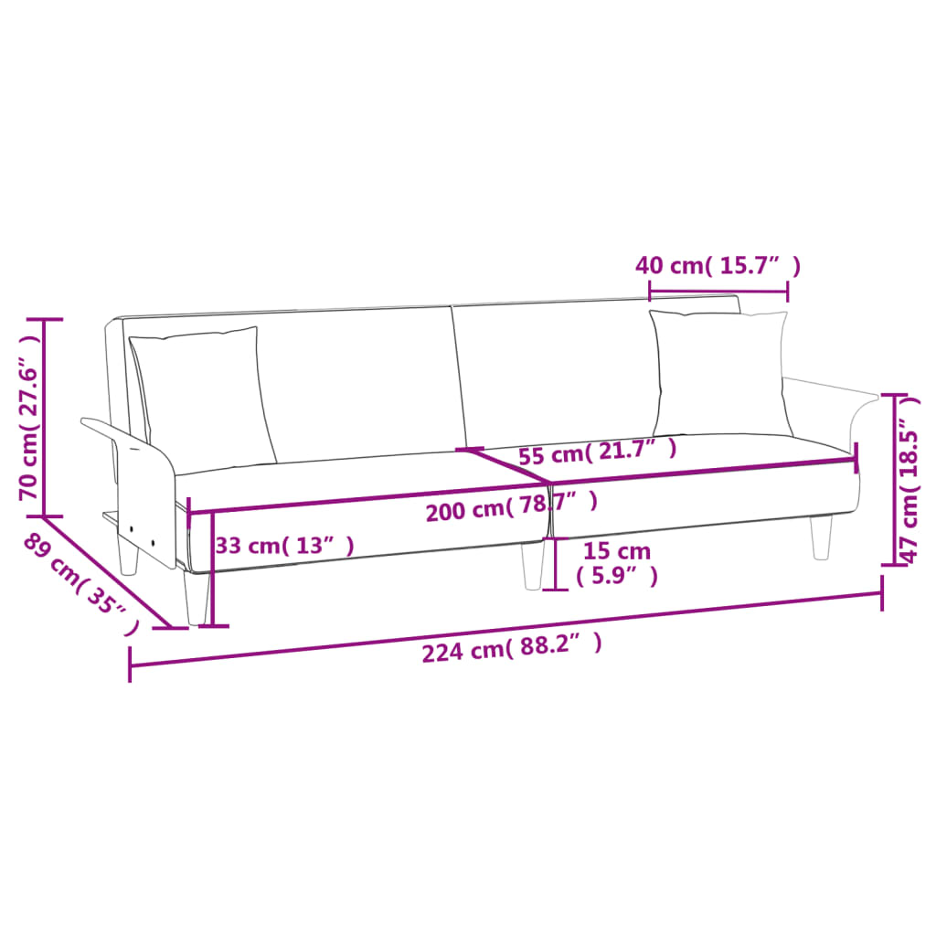 Dieses Schlafsofa eignet sich perfekt für die Übernachtung von Gästen und bietet tagsüber eine bequeme Sitzgelegenheit. Strapazierfähiges Material: Stoff weist eine schlichte und saubere Optik auf und ist außerdem atmungsaktiv und langlebig. Verstellbare Rückenlehne: Du kannst die beiden separaten Rückenlehnen des Bettsofas teilweise oder ganz nach unten schieben, um einen idealen Platz für ein Nickerchen oder ein Doppelbett zu schaffen. Bequemes Sitzerlebnis: Mit dick gepolsterten Sitzflächen, Armlehnen und Rückenlehnen versehen, ist das Schlafsofa sehr bequem.Praktische Kissen: Diese Kissen werten nicht nur deine Einrichtung auf, sondern sorgen auch für zusätzlichen Komfort beim Sitzen oder Liegen. Robuster und stabiler Rahmen: Der Rahmen aus Sperrholz verleiht der Schlafcouch Robustheit und Stabilität. Gut zu wissen:Um die Montage so einfach wie möglich zu machen, wird jedes Produkt mit einer Anleitung geliefert.