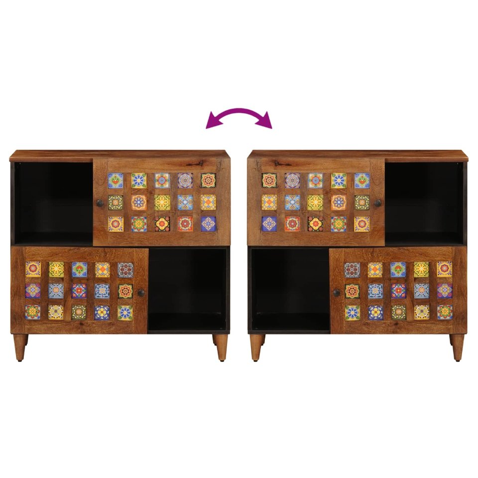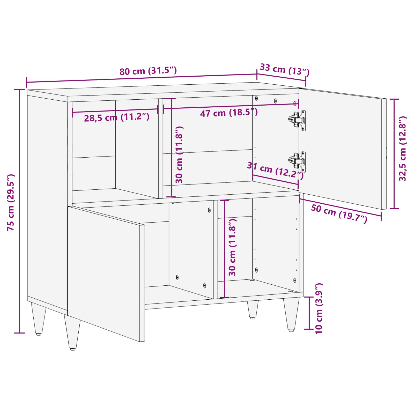 Dieses moderne Sideboard ist ein Muss für jedes Esszimmer oder Wohnzimmer. Mit seinem minimalistischen Design fügt es sich harmonisch in moderne Räume ein. Besonderes Augenmerk wurde auf die Details gelegt, denn es bietet sowohl Stil als auch Funktionalität. Es hat viel Stauraum und verbessert den Look deines Zuhauses. Die schlanke Form und das Holzwerkstoff-Finish machen es super vielseitig und schaffen eine angenehme, warme Atmosphäre. Massivholz-Mango-Rahmen Das Sideboard kommt mit einem stabilen Rahmen aus massivem Mangoholz, das sowohl robust ist als auch schick aussieht. Dieses Material hält den Anforderungen des Alltags stand und bleibt dabei ansprechend. Funktionale Scharniertüren Dank der Scharnier-Türen kommst du ganz einfach in den großen Innenraum. Perfekt für die Aufbewahrung von Essgeschirr oder Deko-Elementen. Das clevere Design sorgt dafür, dass alles benutzerfreundlich und sicher aufbewahrt wird. Schicker Rückabschluss Die Rückseite des Sideboards ist mit MDF verziert, was den Look von allen Seiten aufpeppt und es überall im Raum gut aussehen lässt, ohne die Optik zu stören. Praktische Knopfgriffe Die Knopfgriffe machen das Öffnen und Schließen der Türen leicht. Sie sind nicht nur nützlich, sondern setzen auch einen feinen Akzent zu der modernen Optik des Sideboards. Einfache Pflege Der Aufbau ist ein Kinderspiel, denn du brauchst nur einen Schraubendreher und zwei Personen. Um das Sideboard in gutem Zustand zu halten, regelmäßig abstauben und darauf achten, dass keine nassen Sachen darauf kommen, sodass es lange schön bleibt.