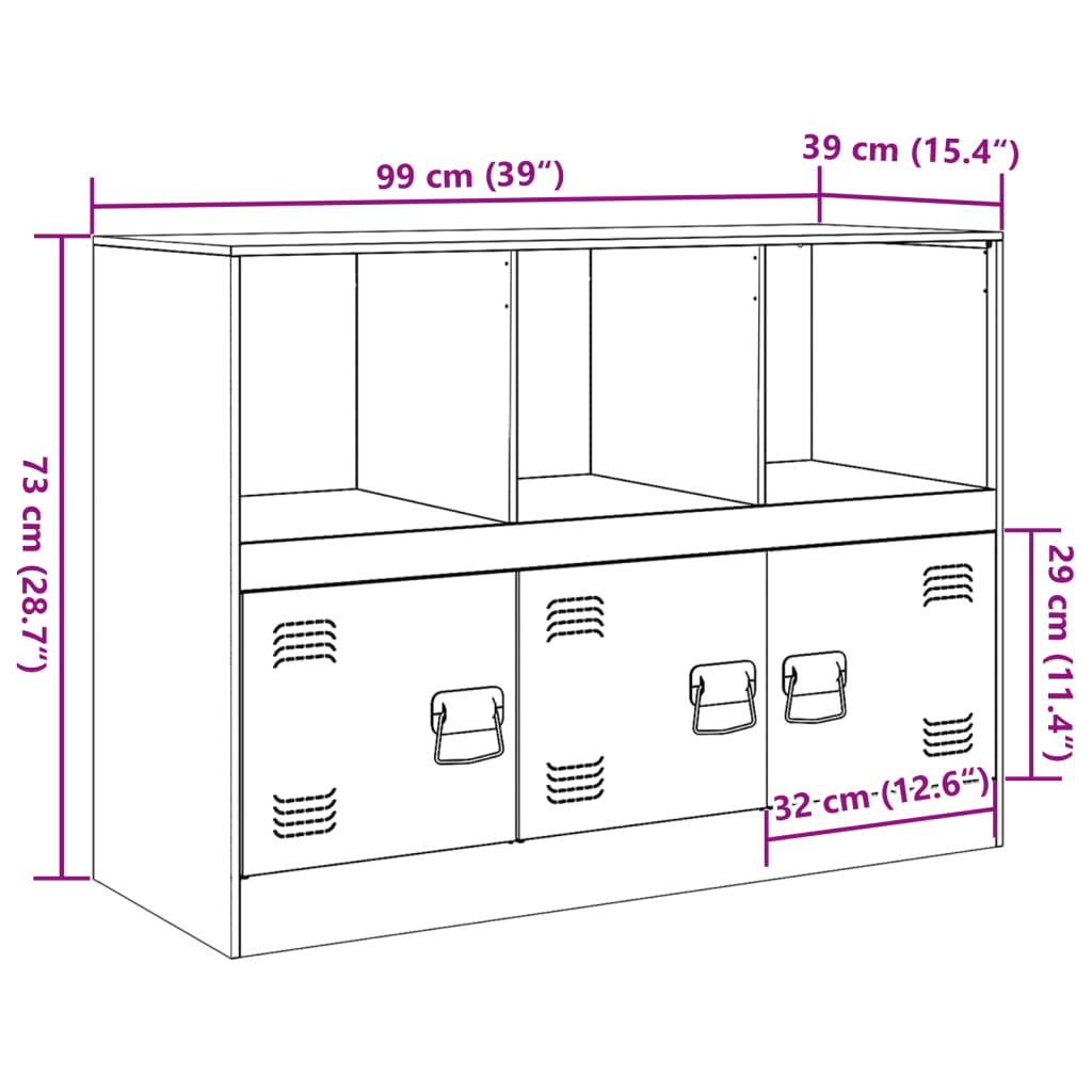 Dieses robuste Sideboard wird mit seinem trendigen und dennoch praktischen Design sicherlich der Mittelpunkt Ihres Wohnzimmers werden. Stabiles Material: Der Rahmen des Sideboards besteht aus kaltgewalztem Stahl. Kaltgewalzter Stahl ist eine Art kohlenstoffarmer Stahl, der im „Kaltwalzverfahren“ hergestellt und bei nahezu normalen Raumtemperaturen verarbeitet wird. Kaltgewalzter Stahl besitzt eine glattere Oberfläche, eine höhere Festigkeit und lässt sich präziser verarbeiten. Reichlich Stauraum: Dieser Schrank bietet praktischen Stauraum für Zeitschriften, Bücher, Bürobedarf, Dokumente und andere Gegenstände, die hier gut geordnet und in Reichweite aufbewahrt werden können.Pflegeleicht: Der Tisch lässt sich mit einem feuchten Tuch leicht reinigen und erfordert wenig Pflege.Praktischer Griff: Das Sideboard ist mit 3 Griffen ausgestattet, die das Öffnen und Schließen des Schranks erleichtern und gleichzeitig zu seiner ansprechenden Optik beitragen. Achtung:Um ein Umkippen zu verhindern, muss dieses Produkt mit einer Wandhalterung (nicht im Lieferumfang enthalten) gesichert werden.
