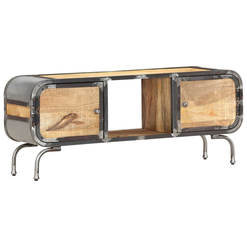 Mit seinem eleganten und stilvollen Design ist dieser TV-Schrank aus Holz eine dekorative und praktische Bereicherung für Ihre Inneneinrichtung. Erstklassiges Material: Dieser TV-Schrank besteht aus massivem Mangoholz, einem Hartholz mit dichten Maserungen. Massives Mangoholz ist nicht nur äußerst belastbar, sondern auch verschleißfest.Stabiler Rahmen: Der Eisenrahmen sorgt für Robustheit und Stabilität und unterstreicht gleichzeitig auch den industriellen Stil des Schrankes.Praktisches Design: Mit 2 Fächern mit Türen und 1 Ablage versehen, bietet der TV-Ständer reichlich Stauraum, um Multimedia-Geräte, Bücher und andere Sachen übersichtlich und griffbereit zu halten. Hinweis:Die Farben können von Artikel zu Artikel variieren, wodurch jedes Möbelstück einzigartig ist. Die Lieferung erfolgt nach dem Zufallsprinzip, wodurch die Exklusivität und Individualität deines Produkts gewährleistet wird.