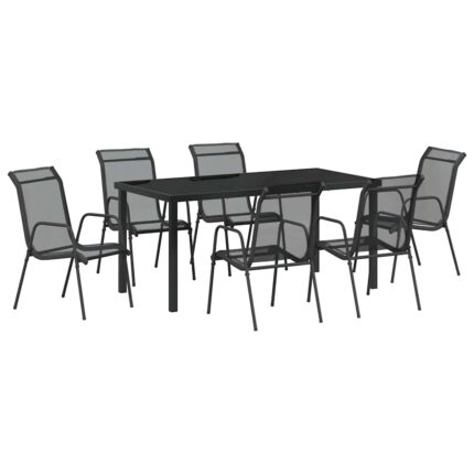 Das moderne Garten-Esszimmer-Set bringt frischen Wind in deine Outdoor-Treffen. Der pulverbeschichtete Stahlrahmen in Schwarz bietet einen coolen Look, der sich